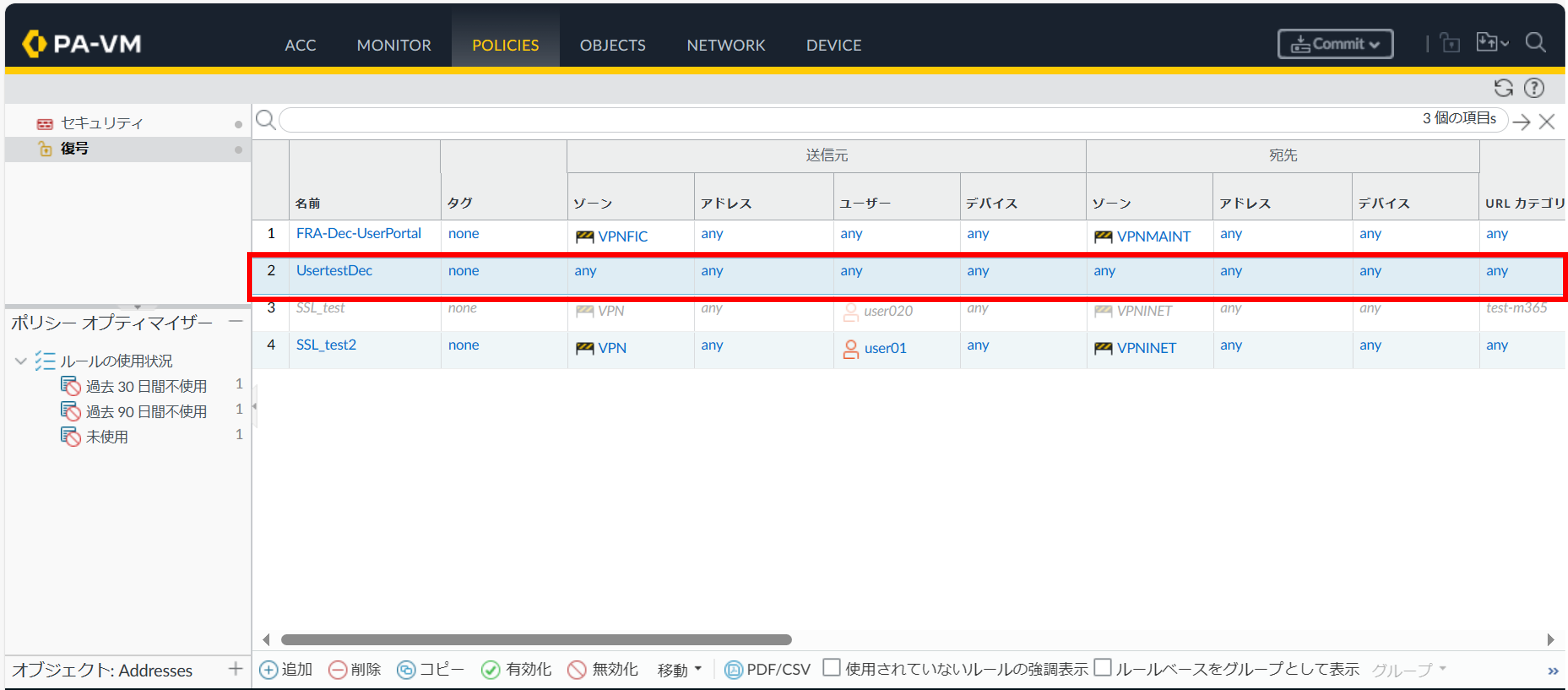 ポリシーの変更はUSER-VPN-to-VPNFICまたはUSER-VPN-to-VPNINETのみ可能です。作成する場合は、変更可能なルールの間または直上直下に設定してください。