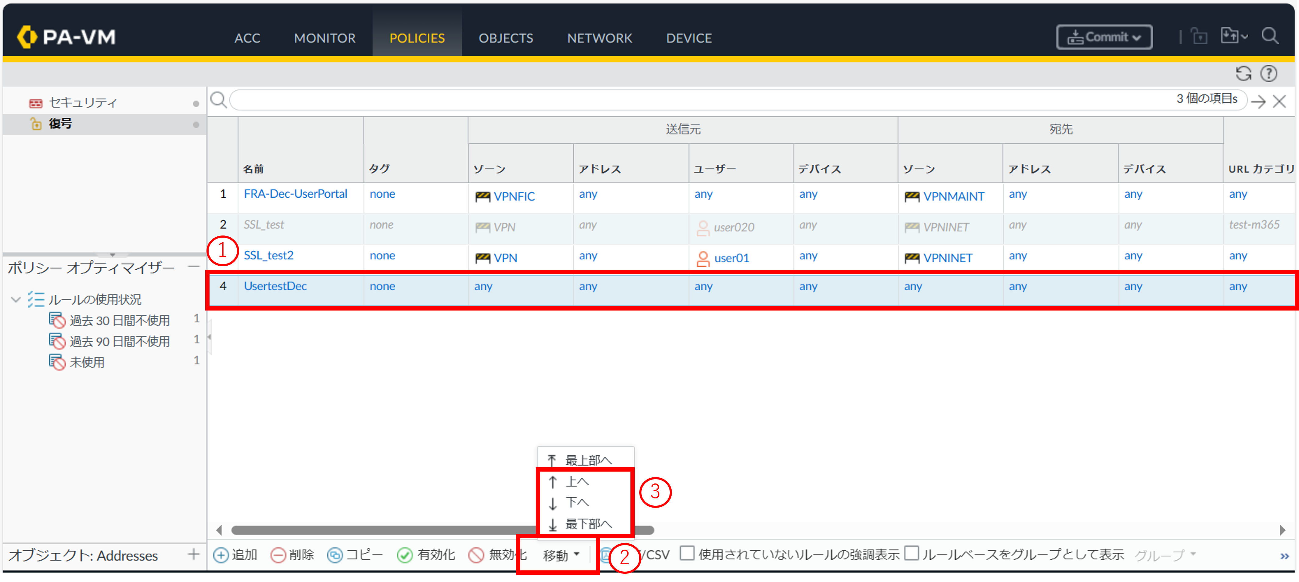 - ➀変更したポリシーを選択します。➁画面下部の[移動]をクリックします。➂いずれかをクリックしFRA-Dec-UserPortalより下の任意の位置に移動します。