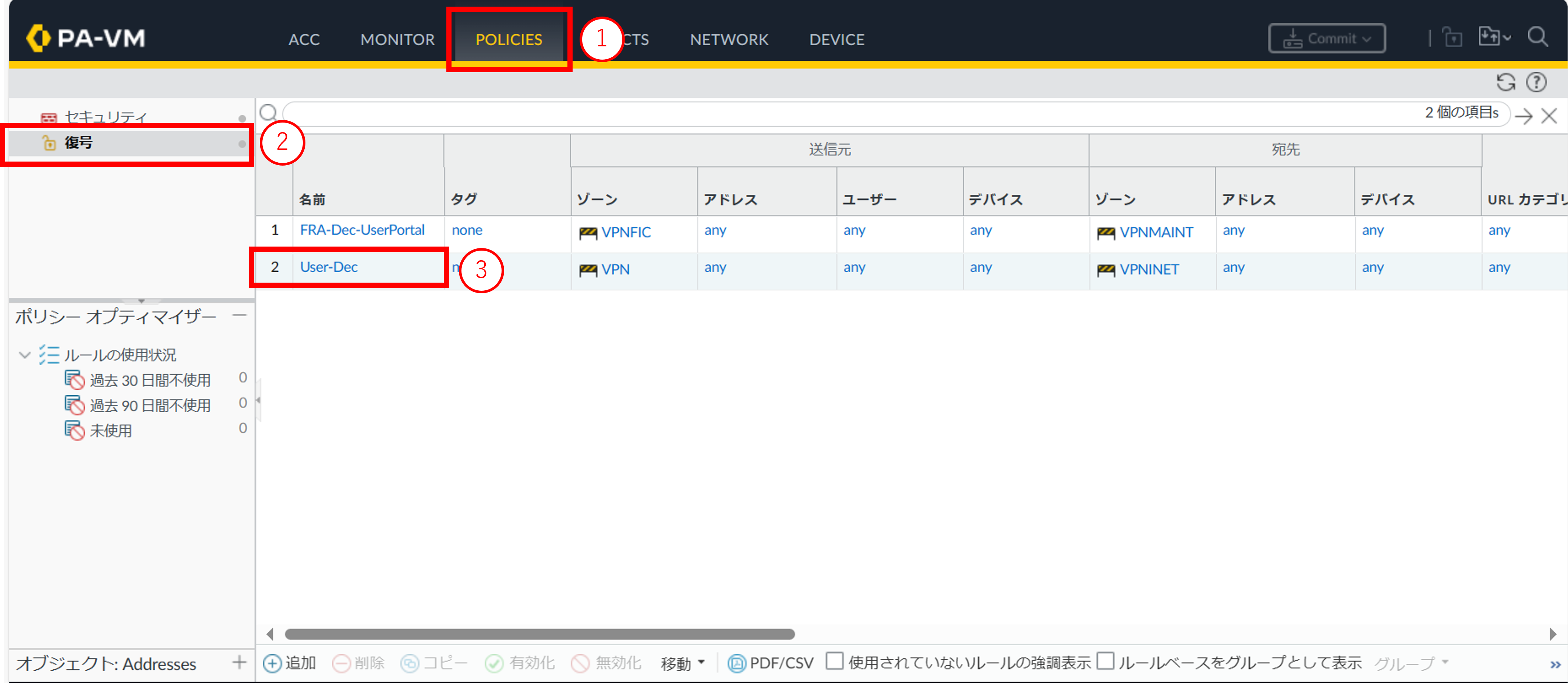 - ➀[Policies]をクリックします。➁[復号]をクリックします。➂削除対象のポリシーをクリックします。