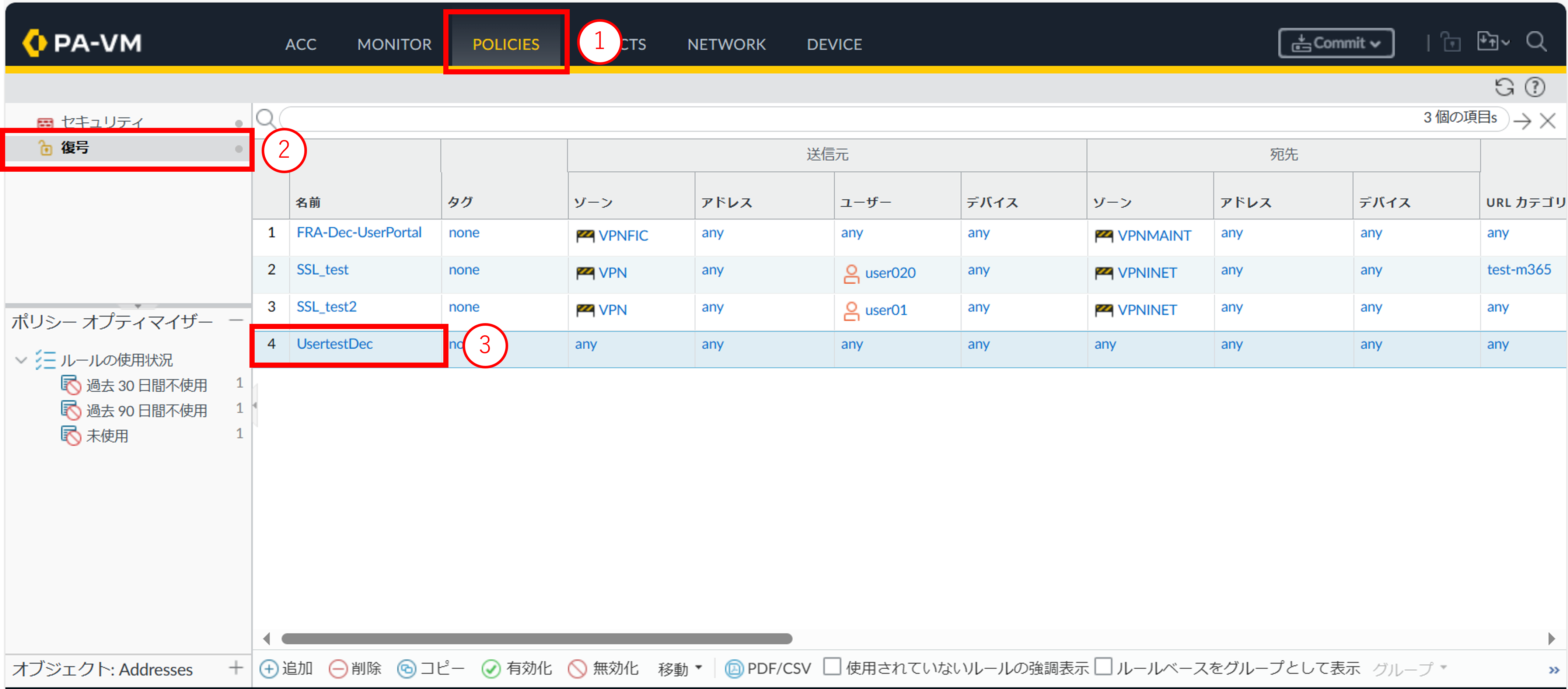 - ➀[Policies]をクリックします。➁[復号]をクリックします。➂有効化または無効化対象のポリシーをクリックします。