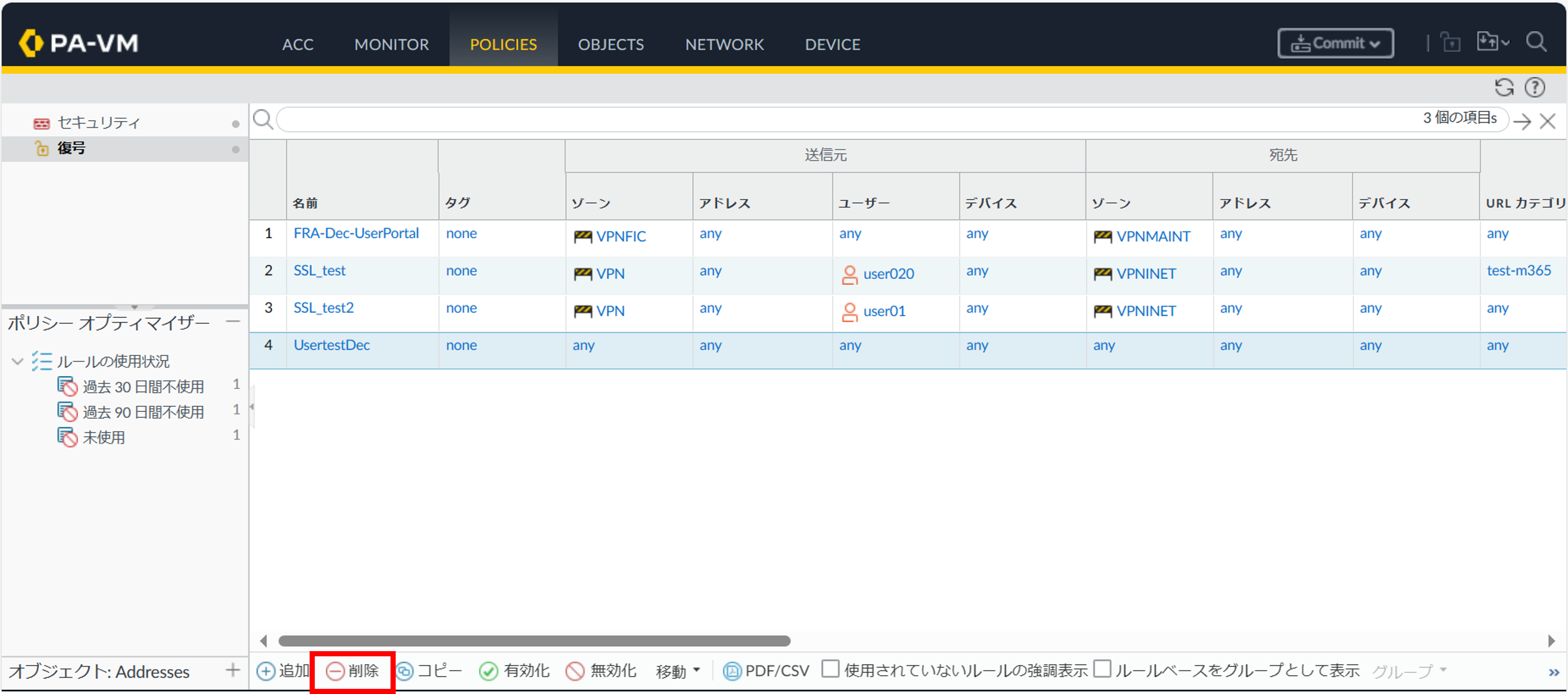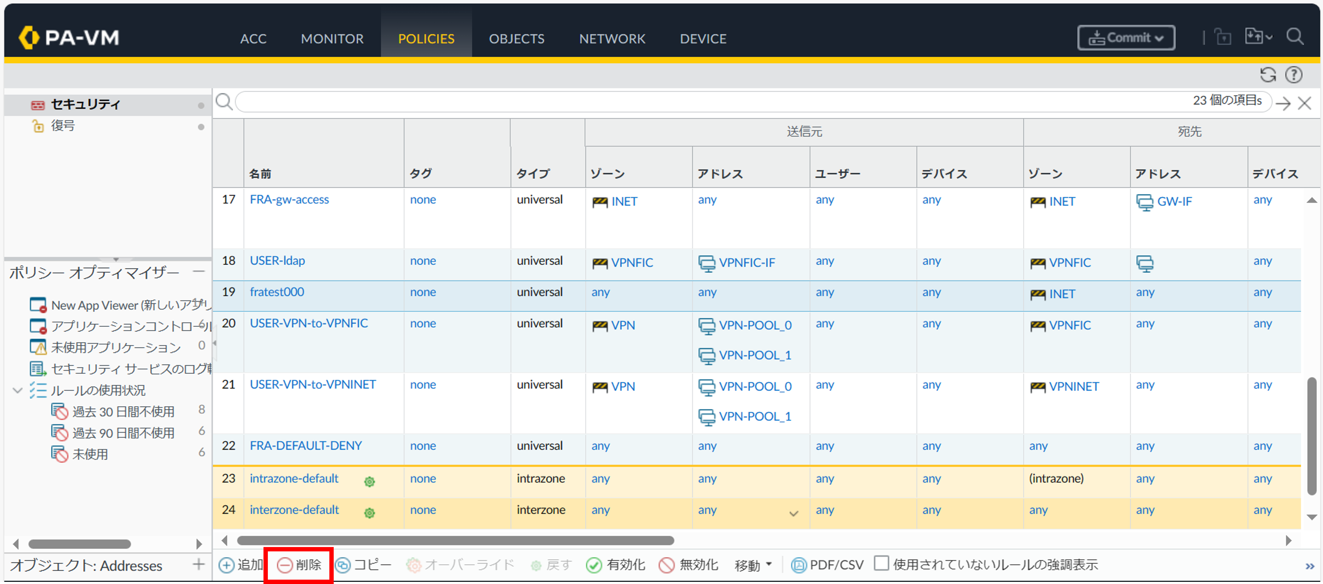 お客様自身で作成したポリシーとUSER-VPN-to-VPNFIC、USER-VPN-to-VPNINET以外は削除しないでください。