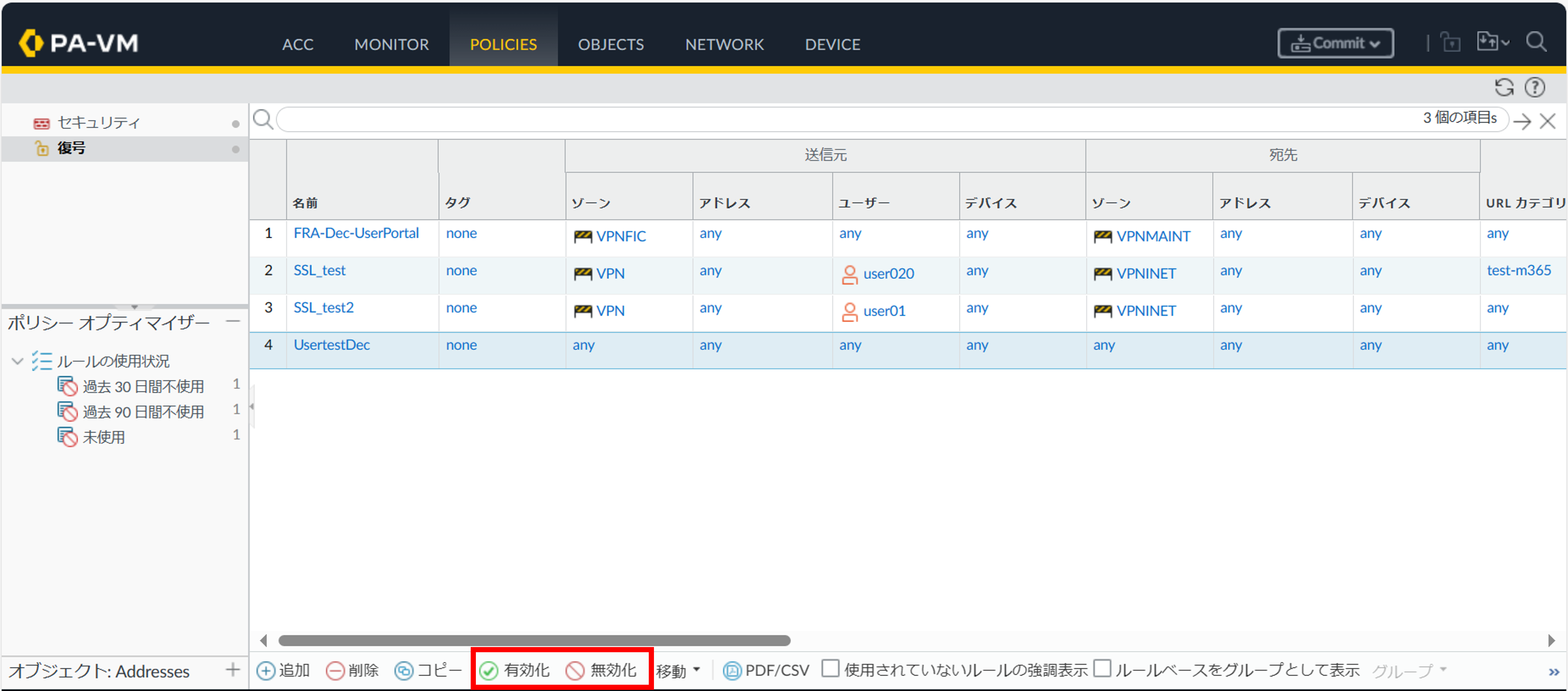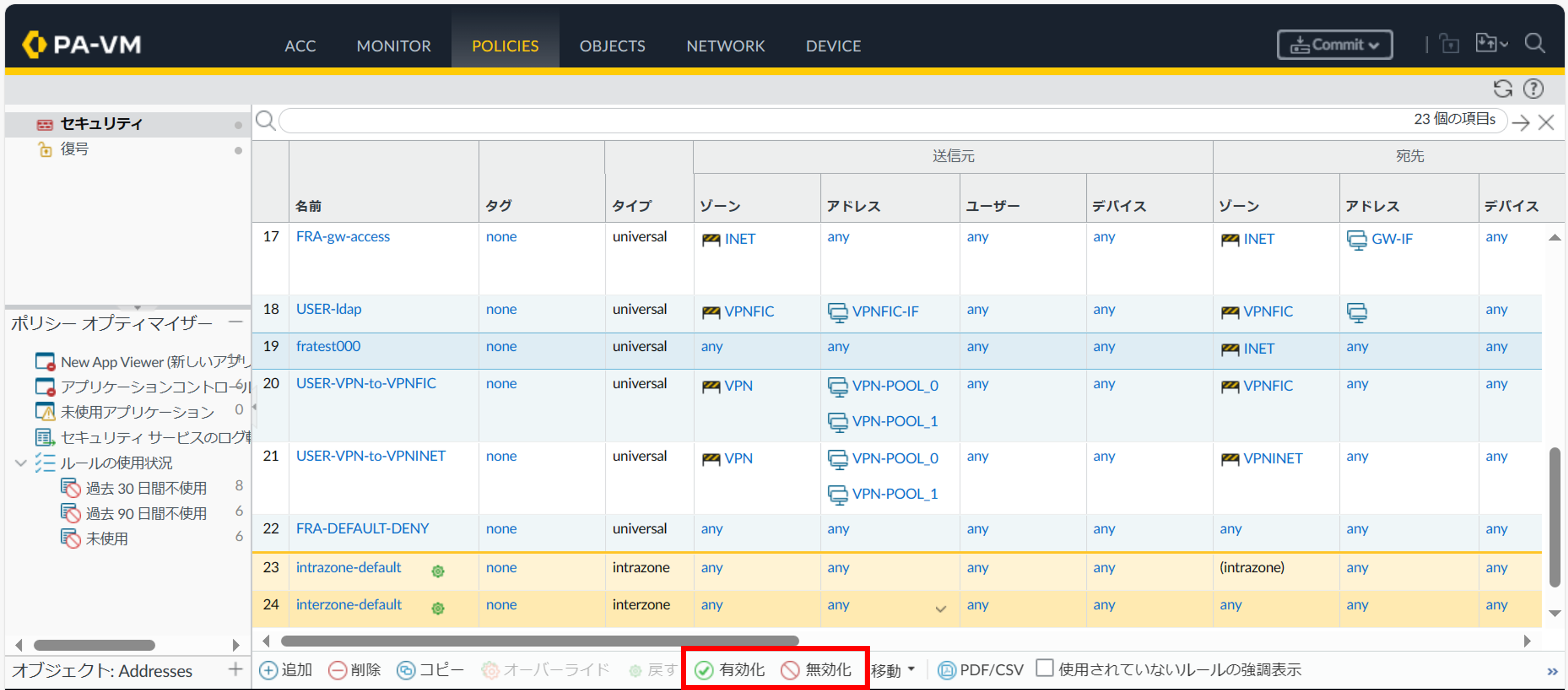 お客様自身で作成したポリシーとUSER-VPN-to-VPNFIC、USER-VPN-to-VPNINET以外は無効化しないでください。