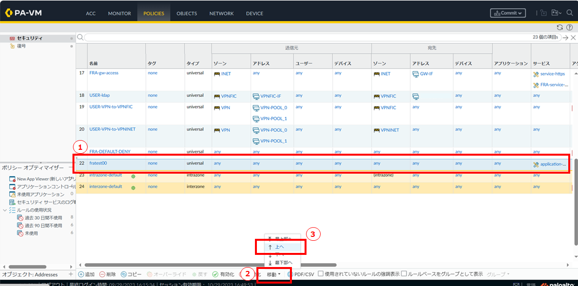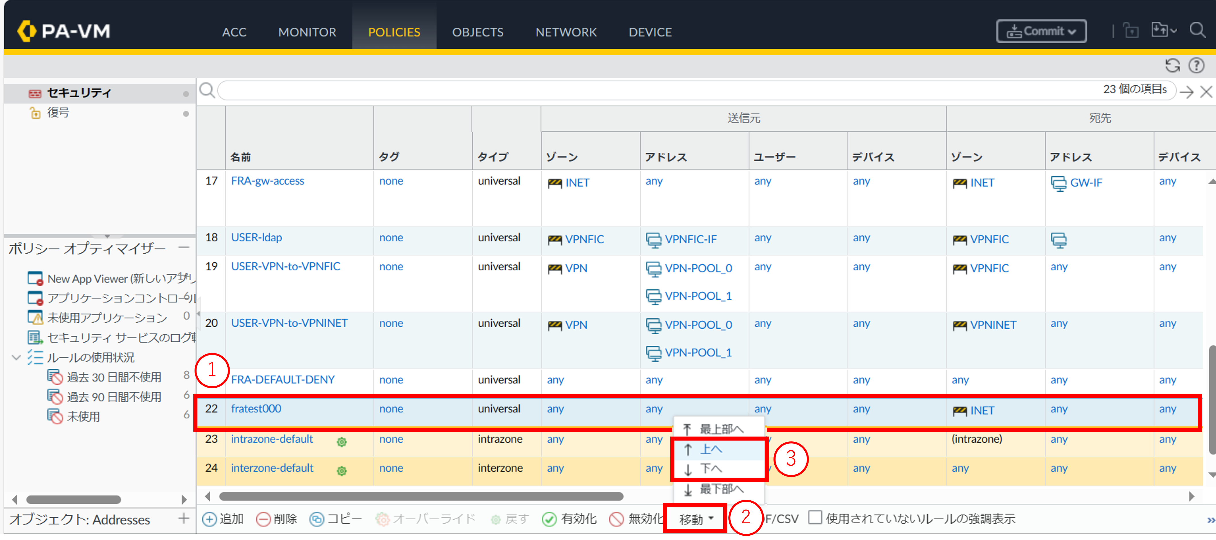- ➀変更したポリシーを選択します。➁画面下部の[移動]をクリックします。➂[上へ]または[下へ]をクリックし変更可能なルールの間または直上直下に移動します。