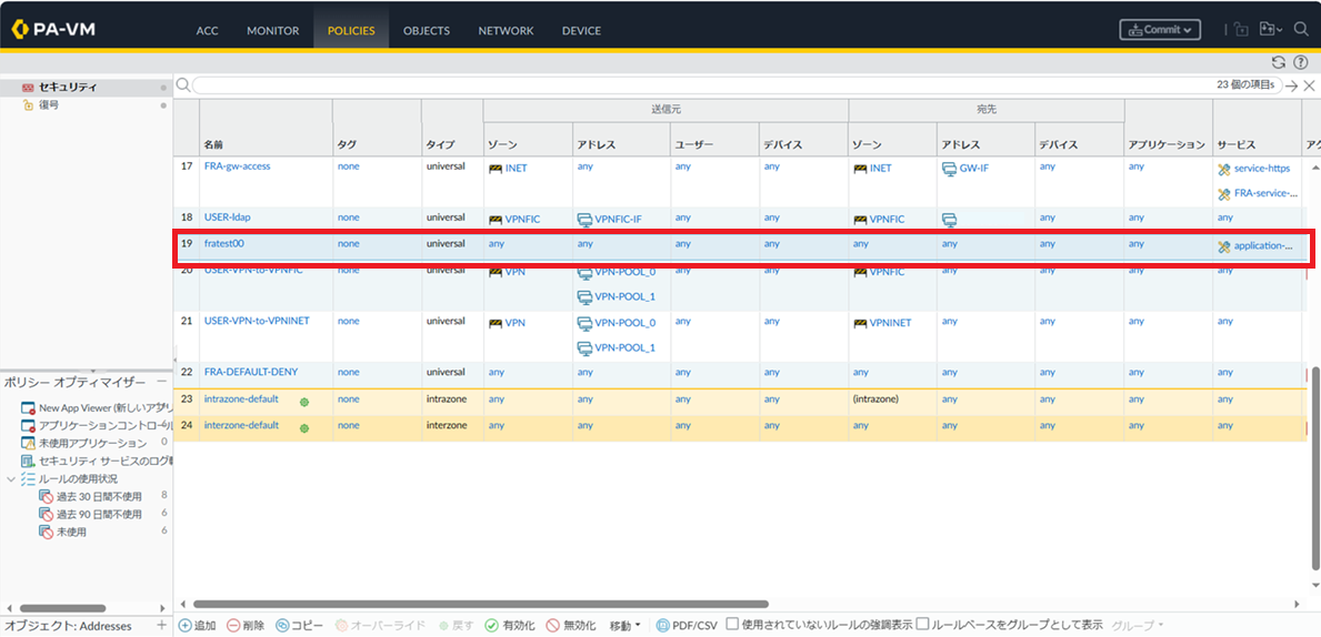 ポリシーの変更はUSER-VPN-to-VPNFICまたはUSER-VPN-to-VPNINETのみ可能です。変更したポリシーを移動する際は変更可能なルールの間または直上直下に設定してください。