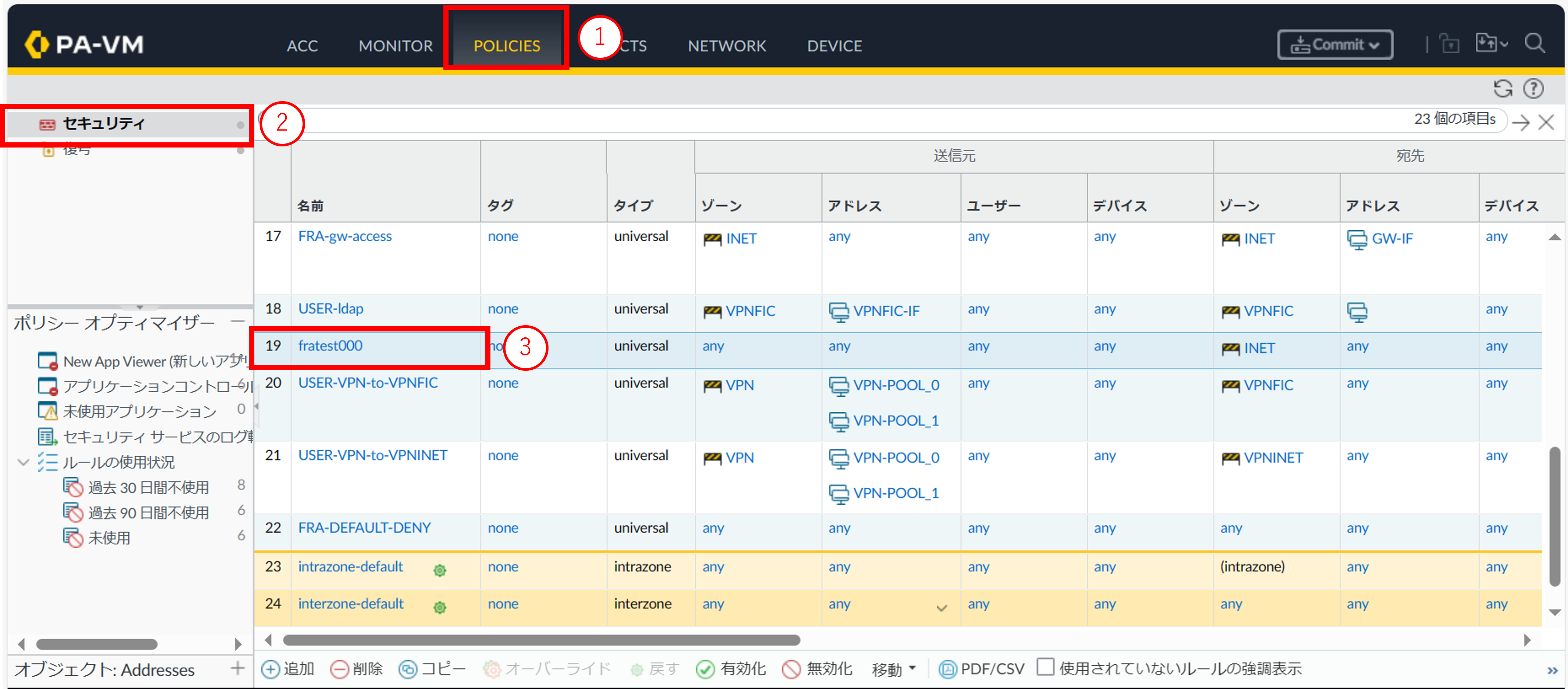 - セキュリティポリシーは一番上から順番に評価されます。例えば本来実行させたい許可ポリシーの上に拒否ポリシーがある場合、拒否ポリシーが優先されるため許可ポリシーが実行されません。セキュリティポリシーの登録順序に注意してください。