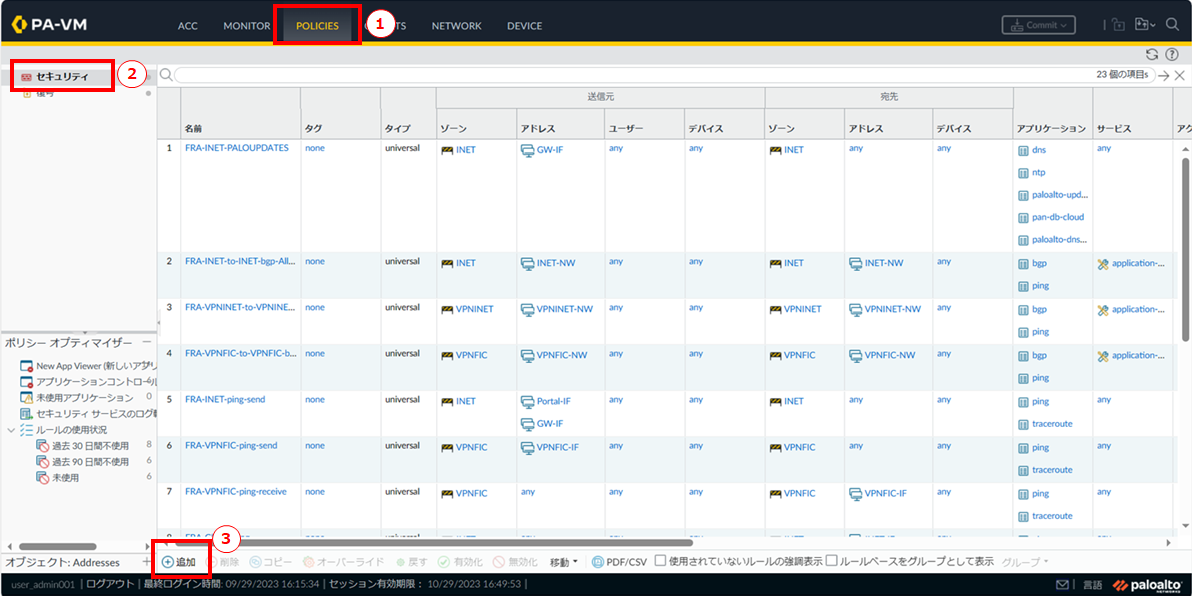 - ①[Policies]をクリックします。②[セキュリティ]をクリックします。③[追加]をクリックします。