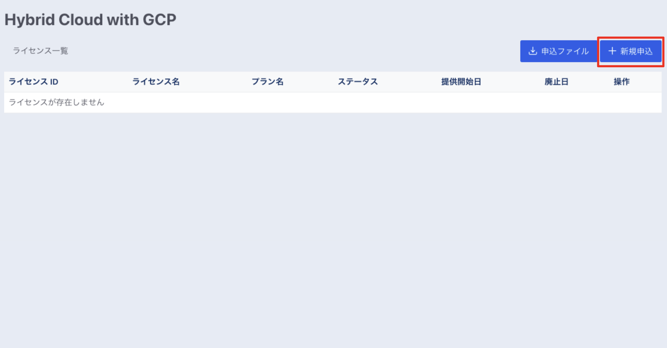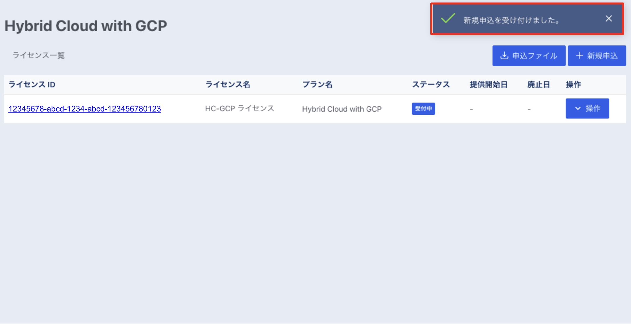 ライセンス一覧画面でお申込み内容が表示されていることをご確認ください。また、通知先メールアドレス宛に受付通知のメールが届きますのでご確認ください。