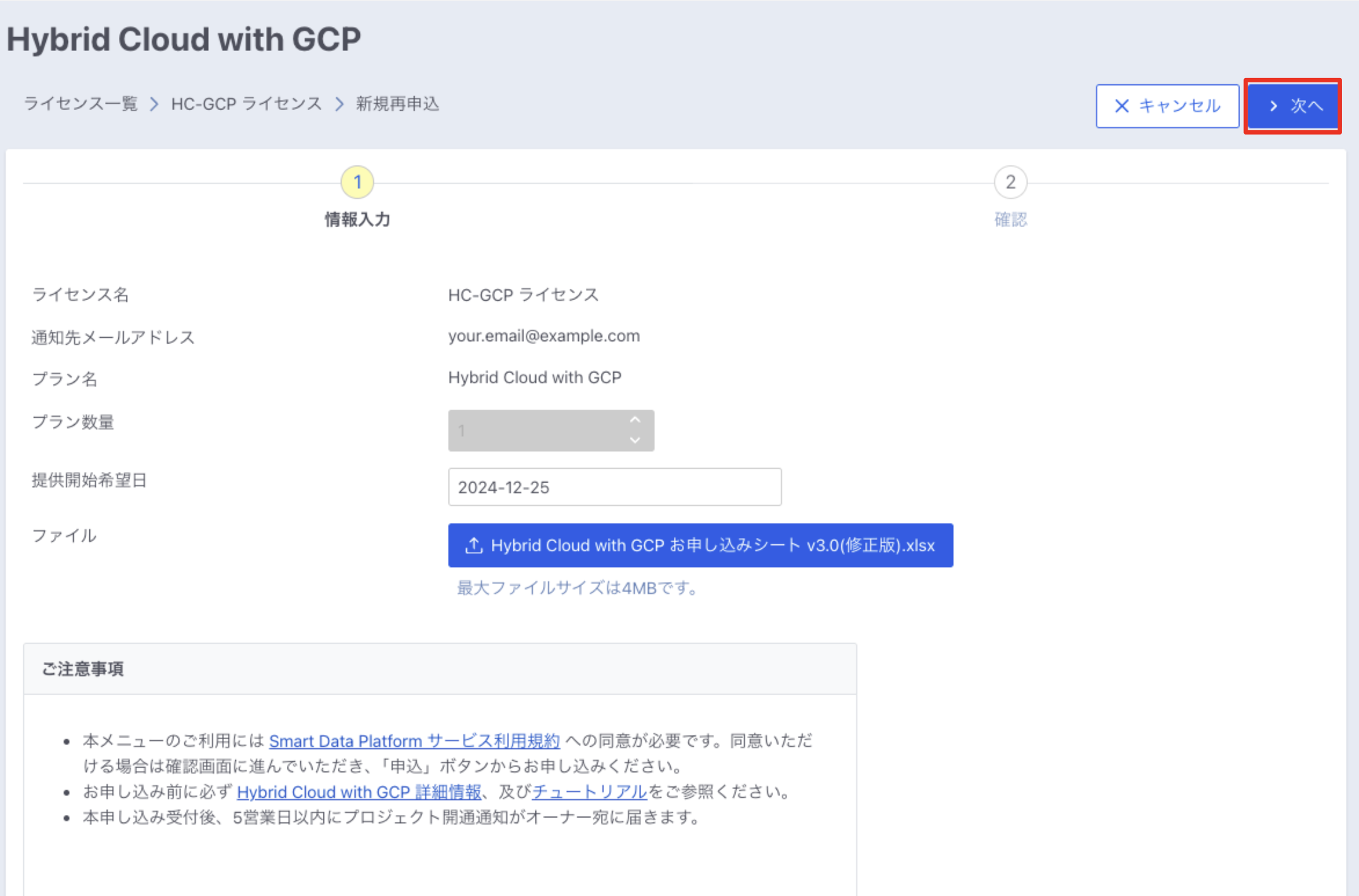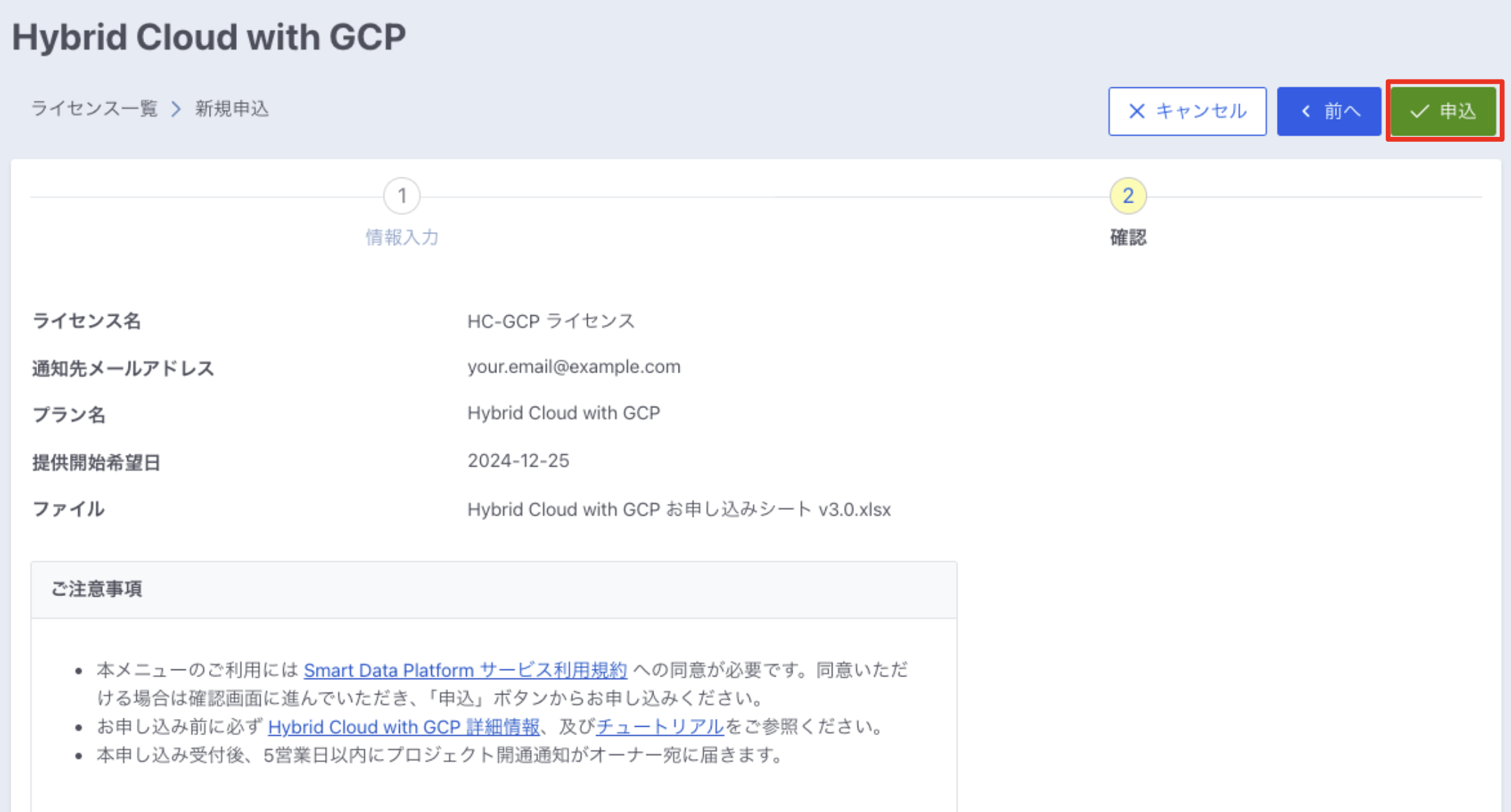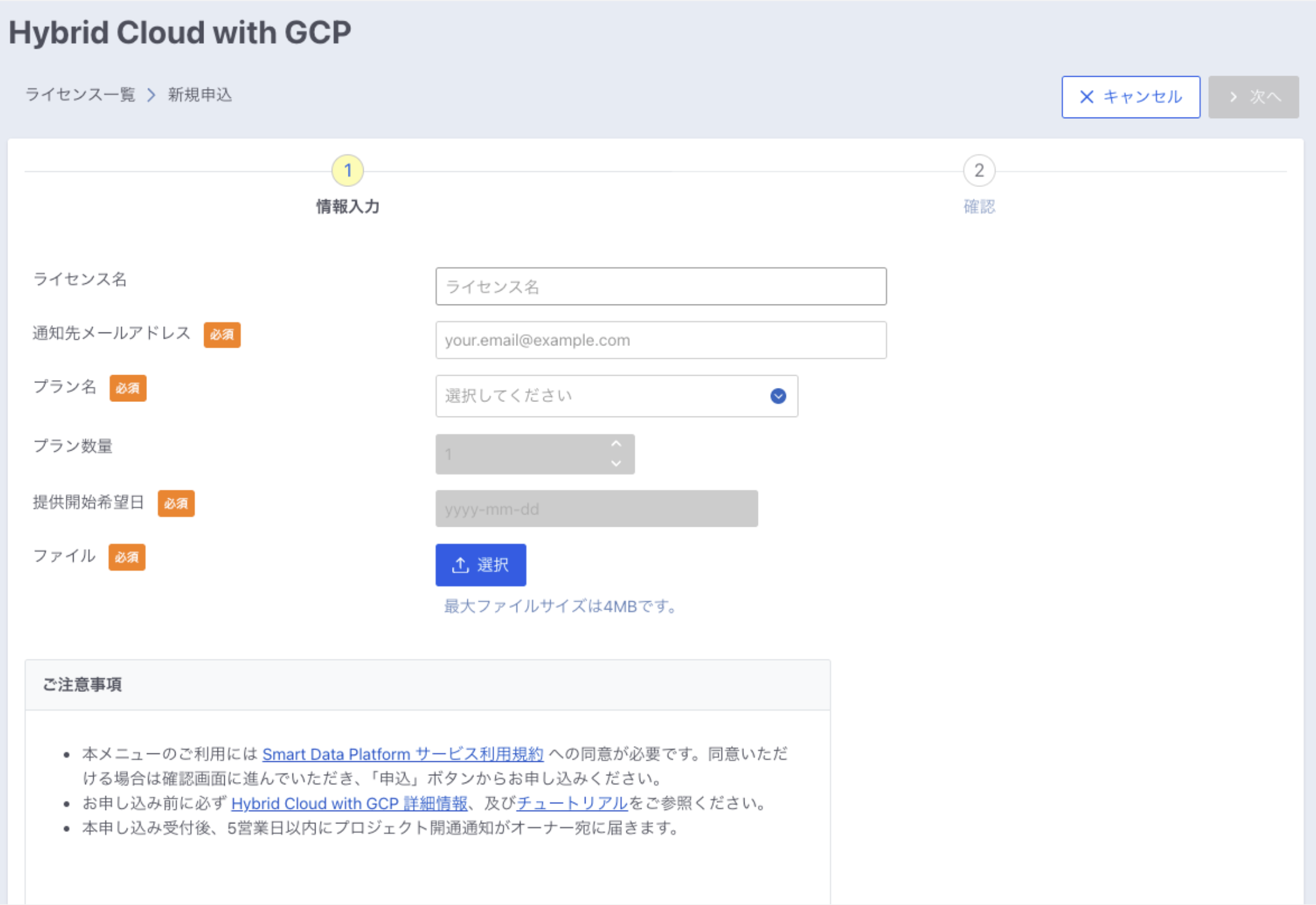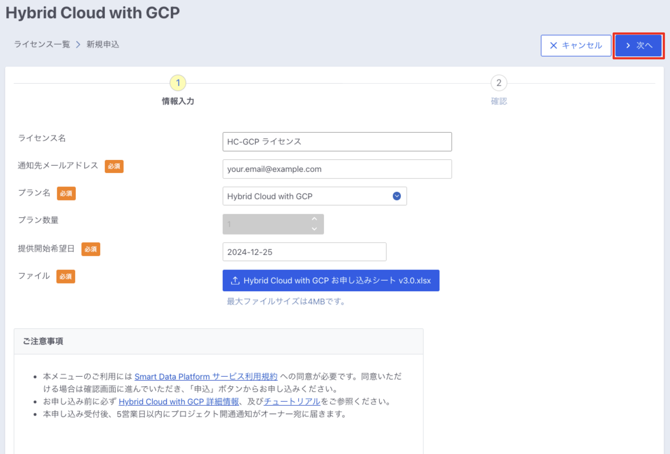 「お申し込み日の5営業日以降」が選択可能となっておりますが、ご指定の日付に関わらず、お申し込みの翌日より5営業日以内でGCPプロジェクトを発行します。 |