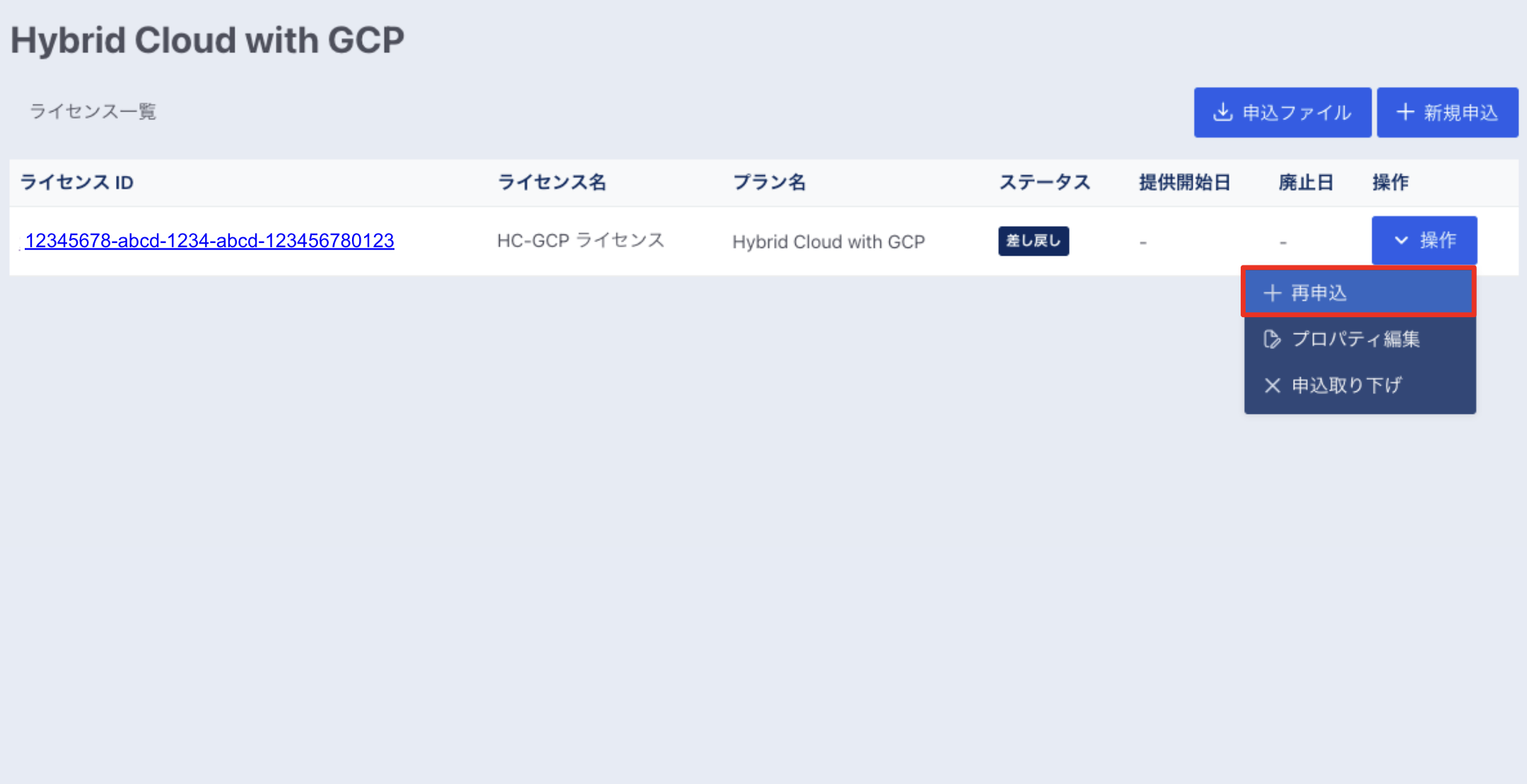 ライセンス一覧画面の「操作」から「再申込」を選択してください。