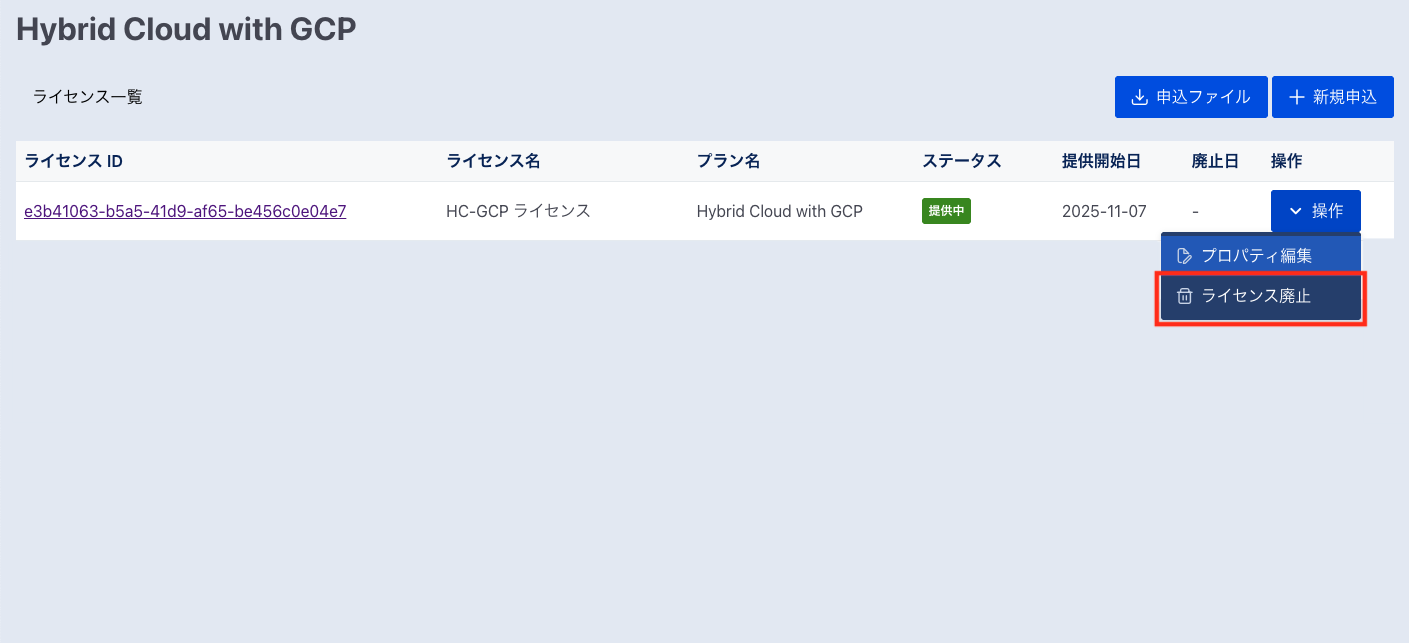 廃止を希望するライセンスの「操作」ボタンを押下して「ライセンス廃止」をクリックします。