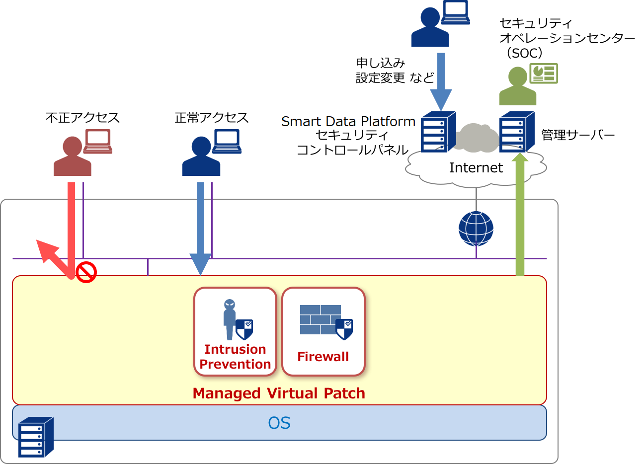 OSやミドルウェア・アプリケーションなどのネットワークを利用した脆弱性に対する既知、および不明な攻撃からシステムを保護します。侵入検知/侵入防御機能(IDS/IPS機能)により、不審な通信を制御します。 |