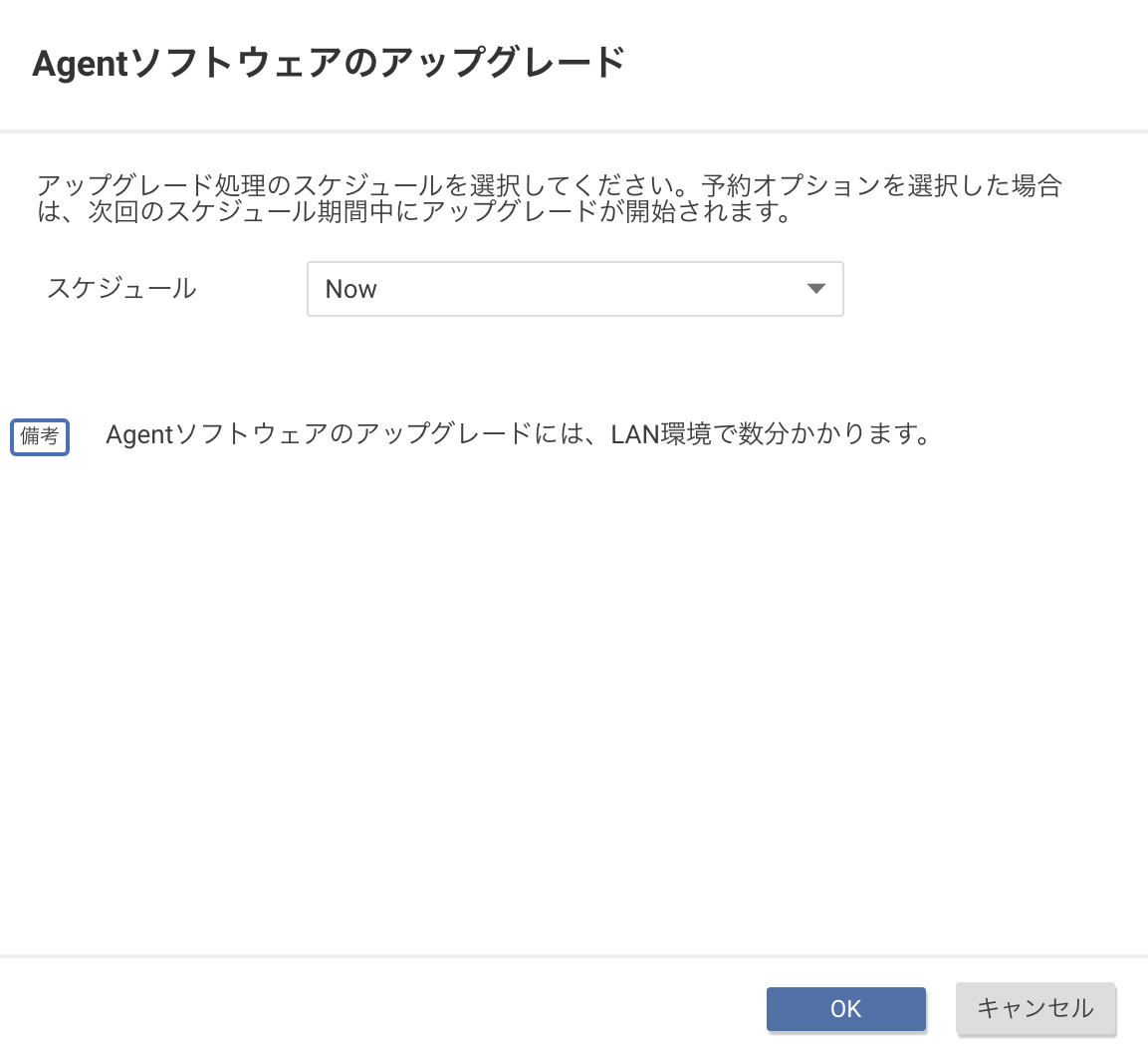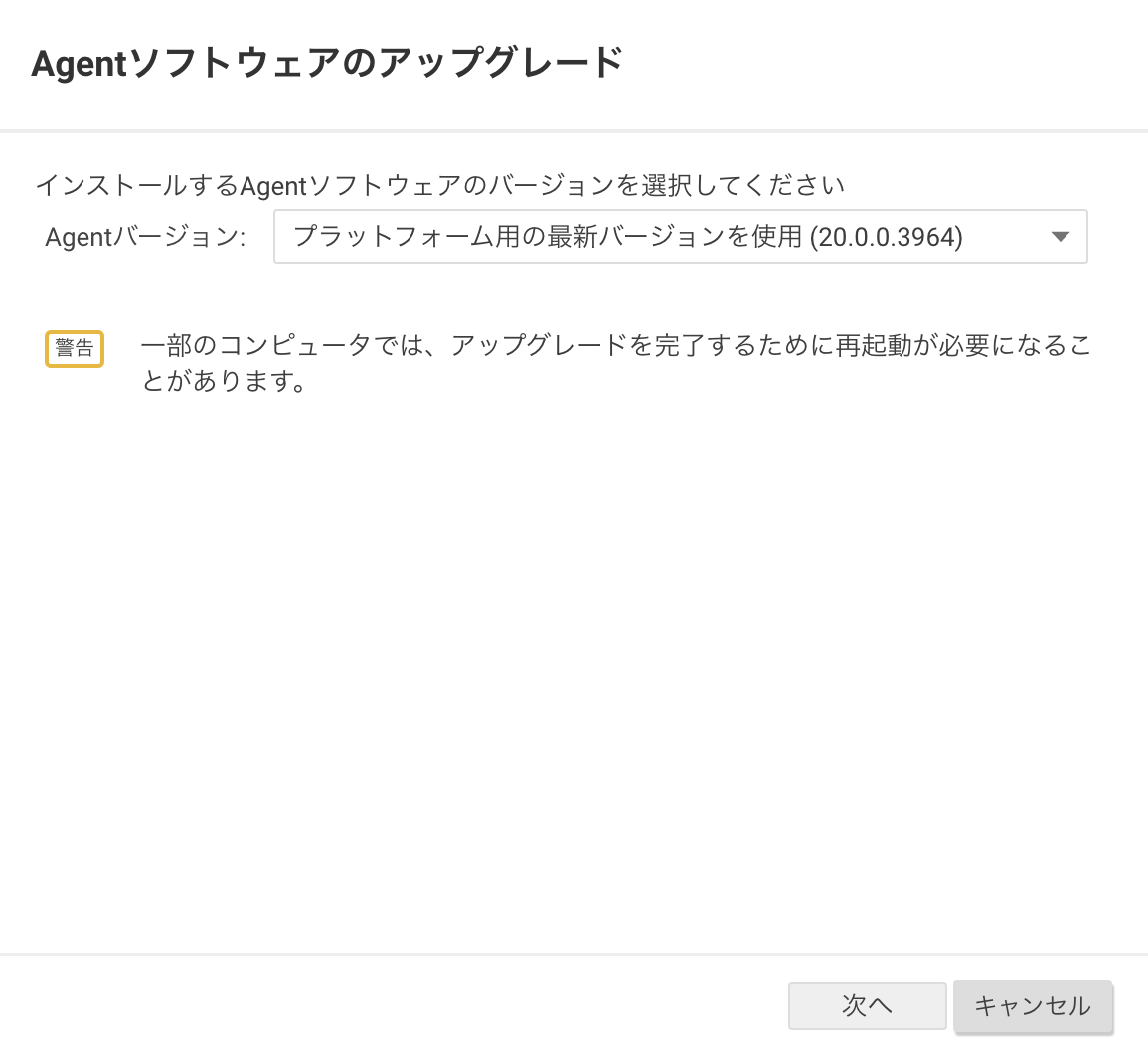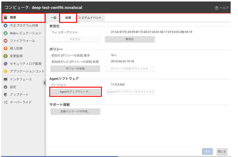 - 表示されたコンピュータ情報の【概要】ペイン⇒【処理】タブ⇒【Agentのアップグレード】をクリックします。