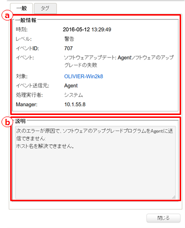 『一般情報』には、このイベントのサマリーが表示されます。注意点としては、ここで表示されている時刻は、管理サーバーに通知された時刻になります。イベント発生時刻は、『説明』に時刻が表示されている場合、そちらの時刻が発生時刻になります。