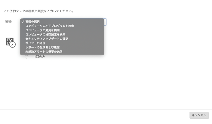 - 表示されたウイザードでどのタスクを作成するのか、実行時間や周期、管理名、実行対象とするポリシー名やコンピュータ名を設定します。