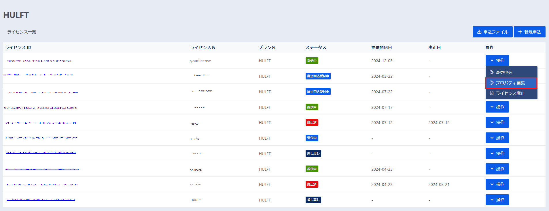 「ライセンス一覧」画面で「プロパティ編集」をクリックします。