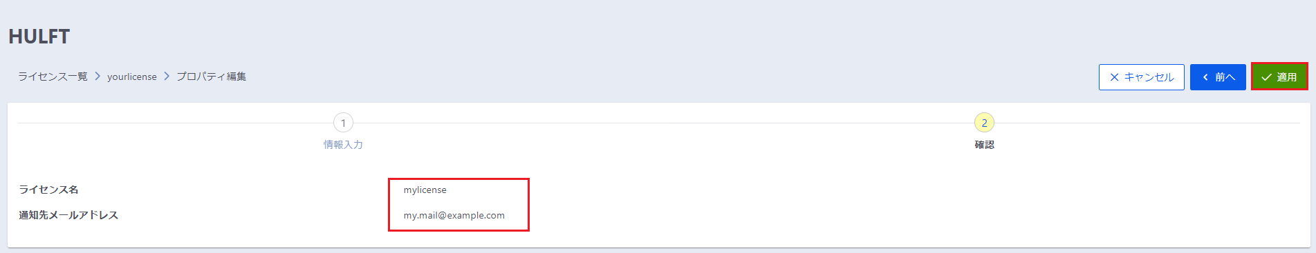 「ライセンス名」、「通知先メールアドレス」を編集し、「次へ」をクリックします。
