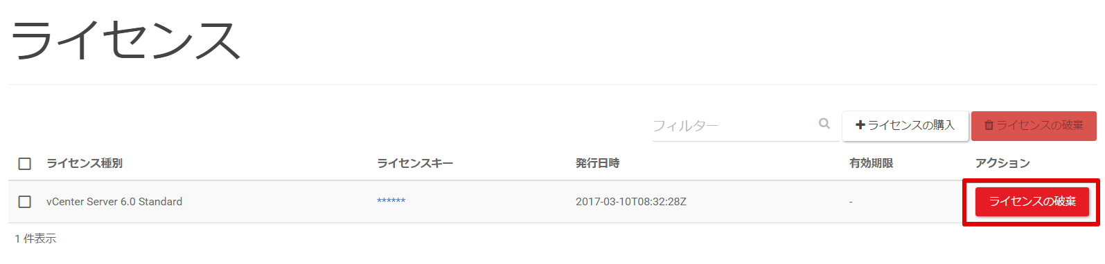 以下ライセンスリストから、対象のライセンス横にあるライセンスの破棄を押下します。