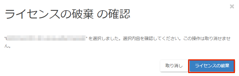 ポップアップ画面にて破棄対象ライセンスか確認し、ライセンスの破棄を押下します。