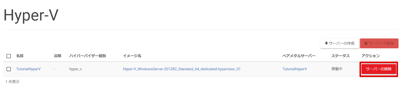 Hyper-V(以下、サーバー)を削除します。
