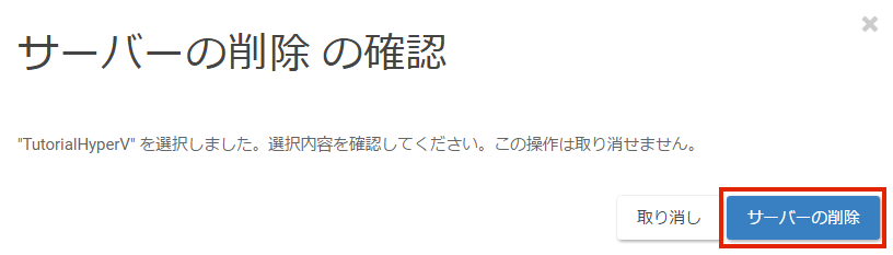 「サーバーの削除」の実行後、削除処理を止めることはできません。サーバ内のデータの復元も実施できませんのでご注意ください。