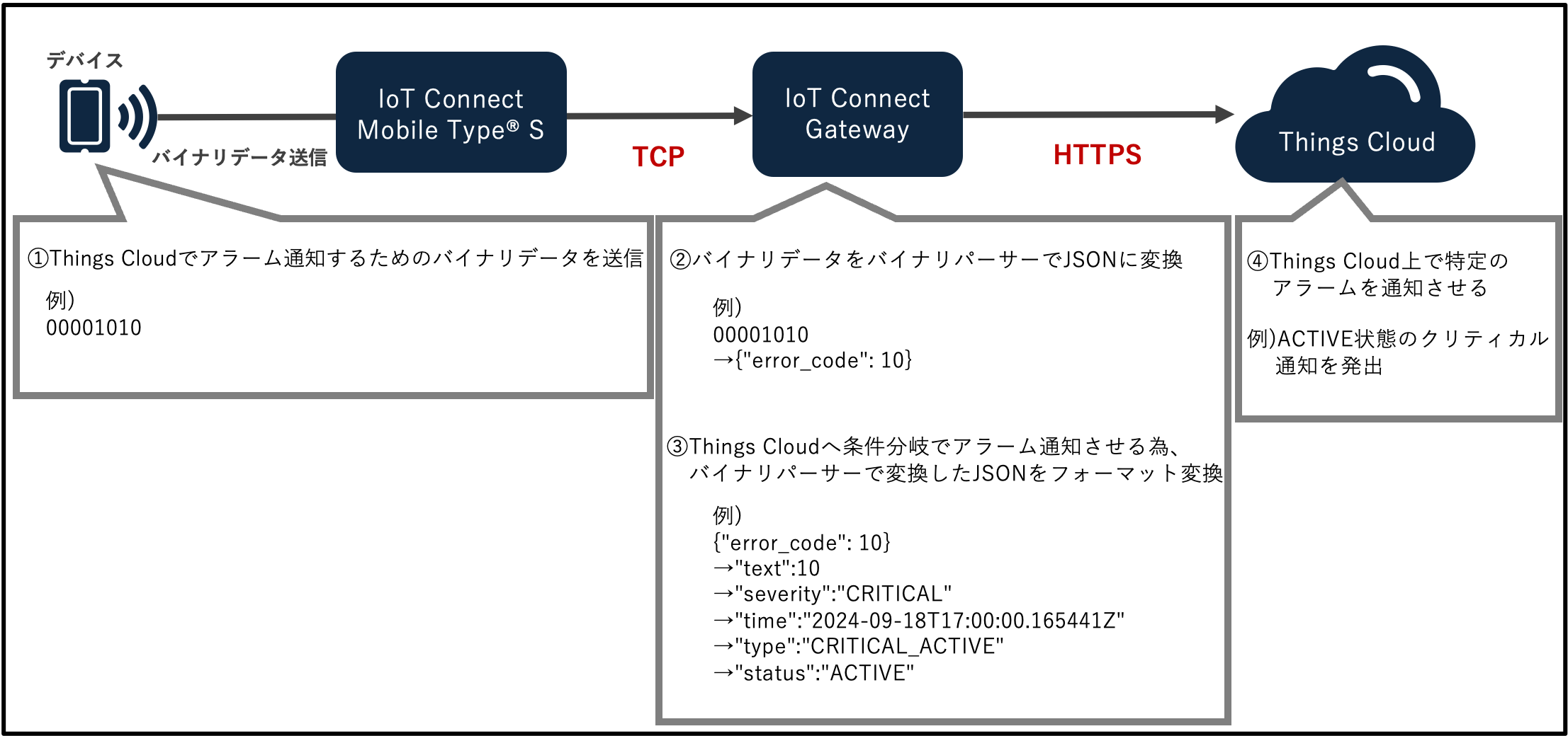 デバイス側のバイナリデータ送信例とThings Cloud側のアラーム通知例を説明します。
