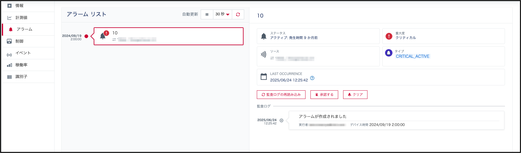 Status Code: 201 JSON Data: { "self": "https://tXXXXXXXXX.je1.thingscloud.ntt.com/alarm/alarms/XXXXXX", "id": "XXXXXX", "type": "CRITICAL_ACTIVE", "text": "10", "status": "ACTIVE", "severity": "CRITICAL", "history": { "self": "https://tXXXXXXXXX.je1.thingscloud.ntt.com/audit/auditRecords", "auditRecords": [] }, "count": 1, "source": { "self": "https://tXXXXXXXXX.je1.thingscloud.ntt.com/inventory/managedObjects/XXXXXX", "id": "XXXXXX", "name": "XXXXX" }, "time": "2024-09-18T17:00:00.165Z", "creationTime": "2025-06-24T12:25:42.293+09:00", "lastUpdated": "2025-06-24T12:25:42.293+09:00" }