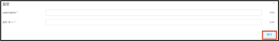 docomo IoT回線管理プラットフォーム の連携設定画面が表示されるので、ControlCenterログイン時のUserName、APIキーを入力して実行をクリックします。