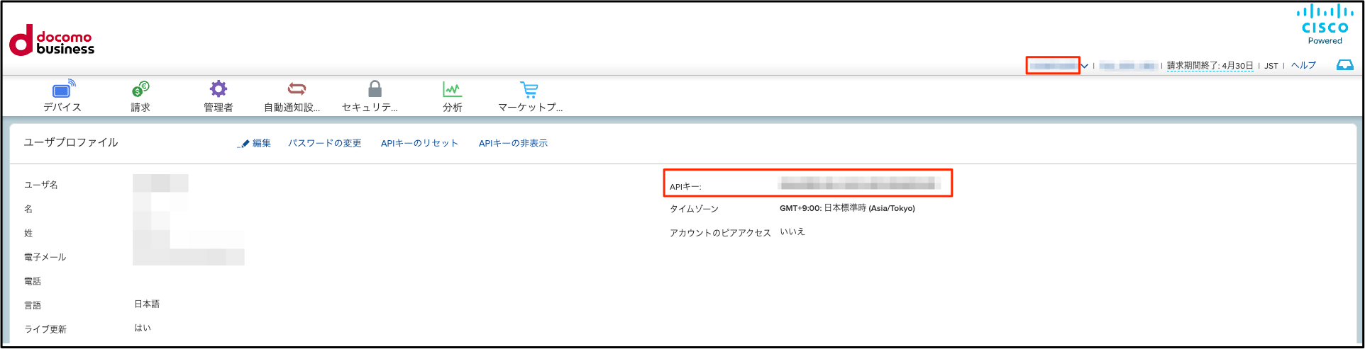 APIキーは、ControlCenterにログイン > ユーザー名をクリック > ユーザープロファイル画面の「APIキーの表示」をクリック > 表示されているAPIキーを使用します。