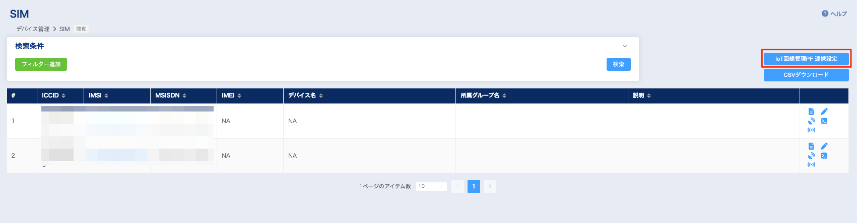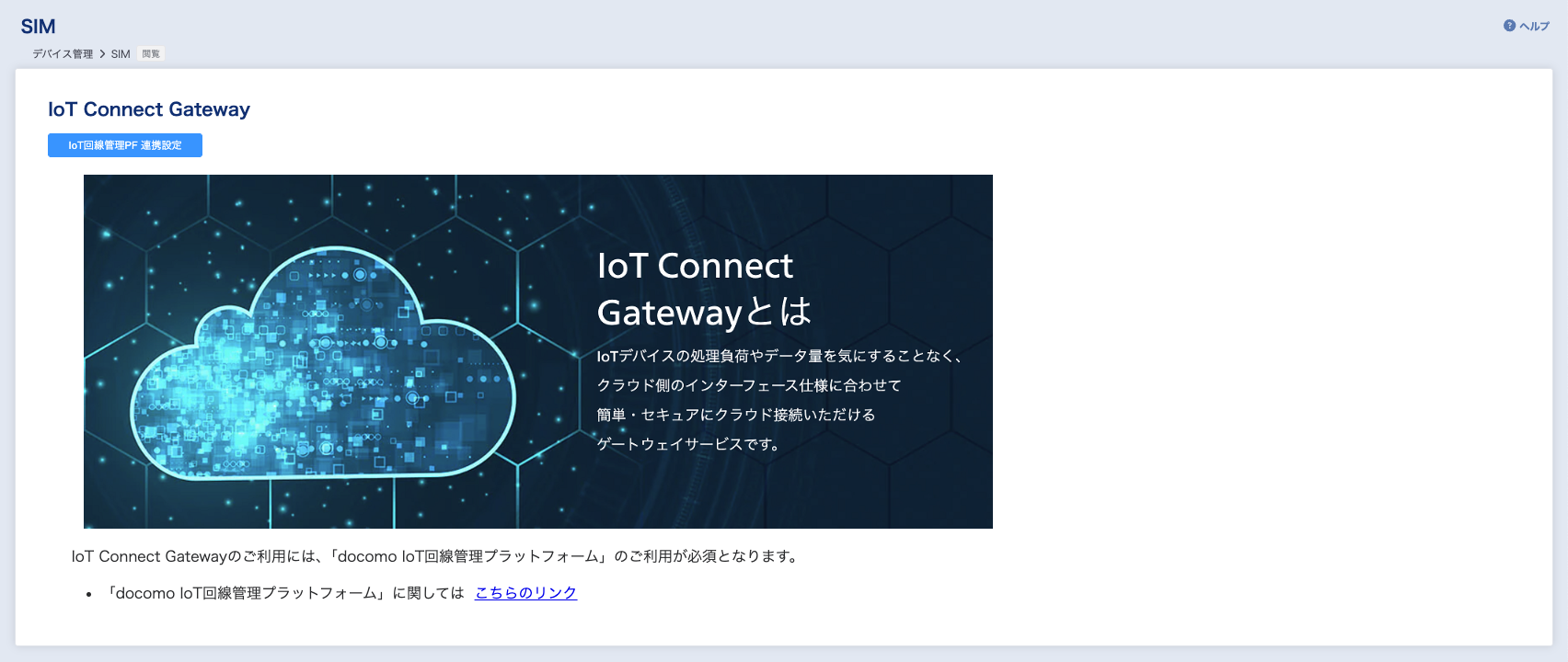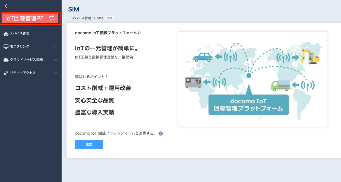 画面右上の「IoT回線管理PF連携設定」をクリックします。