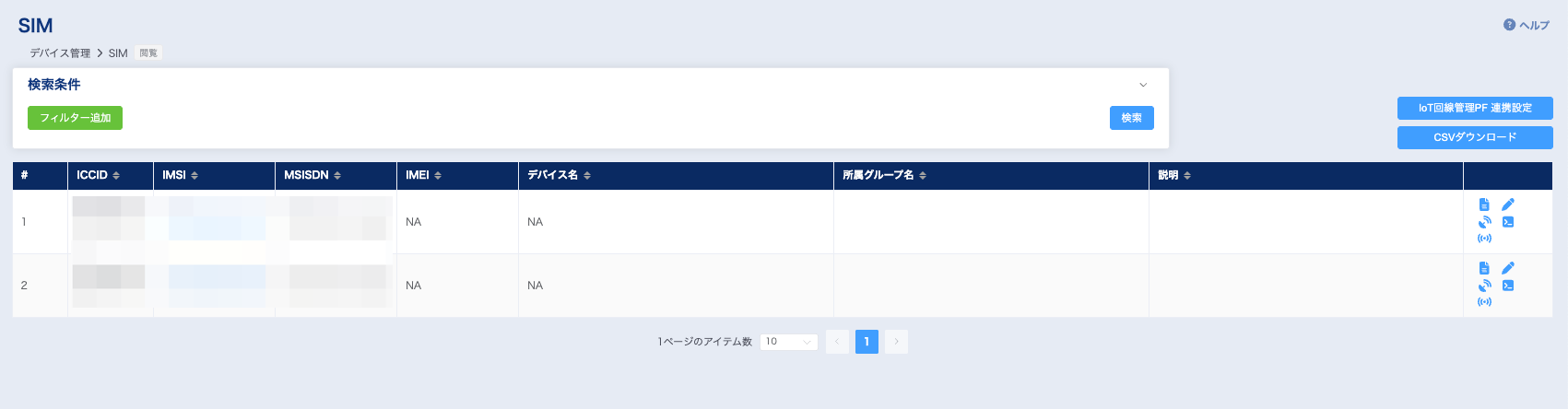 しばらく待ってからブラウザの更新ボタンをクリックすると、連携を実行したアカウントのSIM一覧が表示されます。