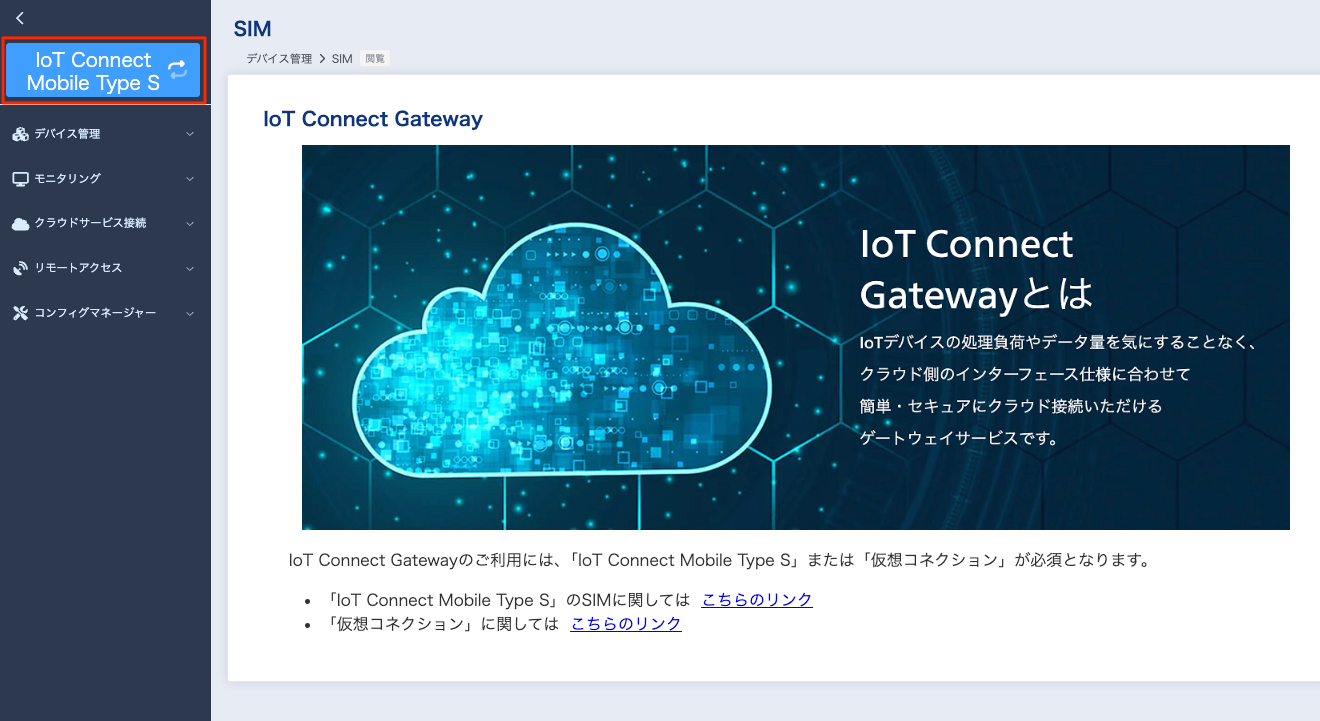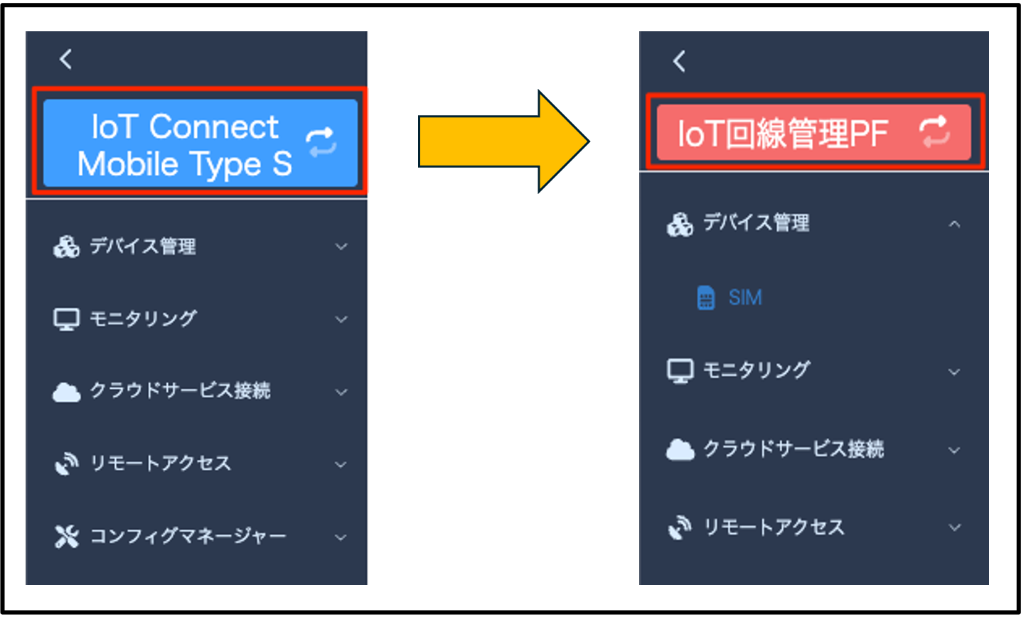 切り替えボタンをクリックすると、「IoT Connect Mobile Type S」から「IoT回線管理PF」のコンソール画面に切り替わります。
