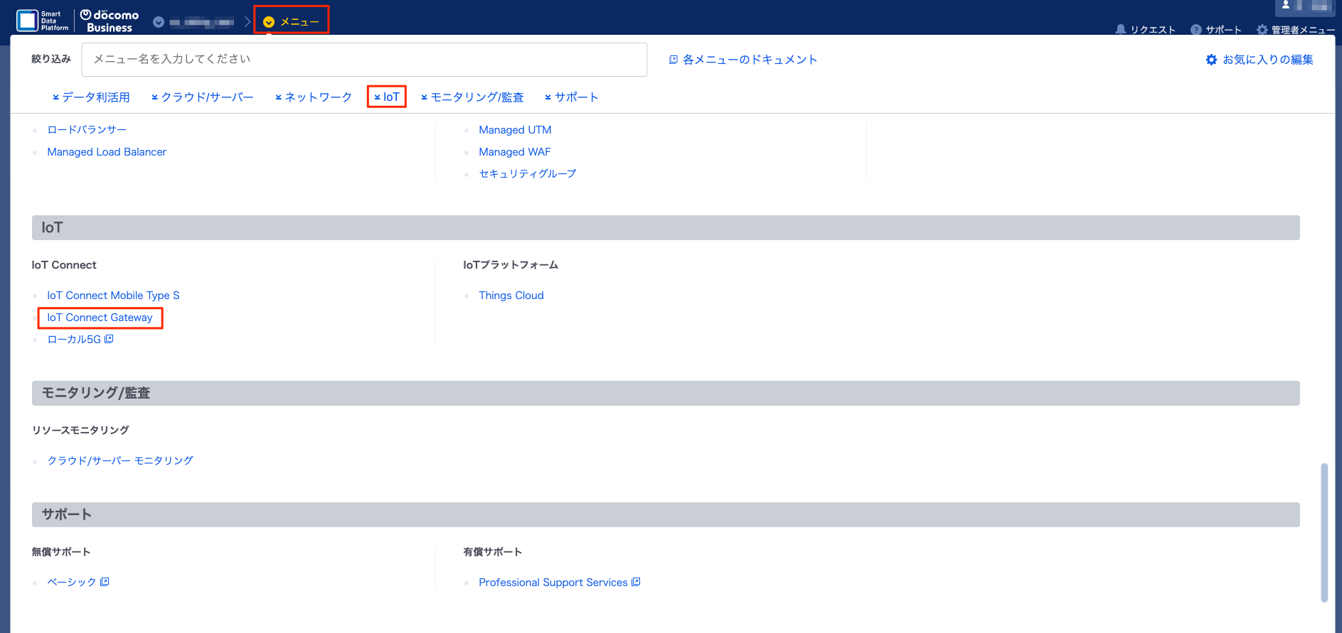 ビジネスポータルにログインし、対象のワークスペースを選択後、メニューから「 IoT Connect Gateway 」を選択します。