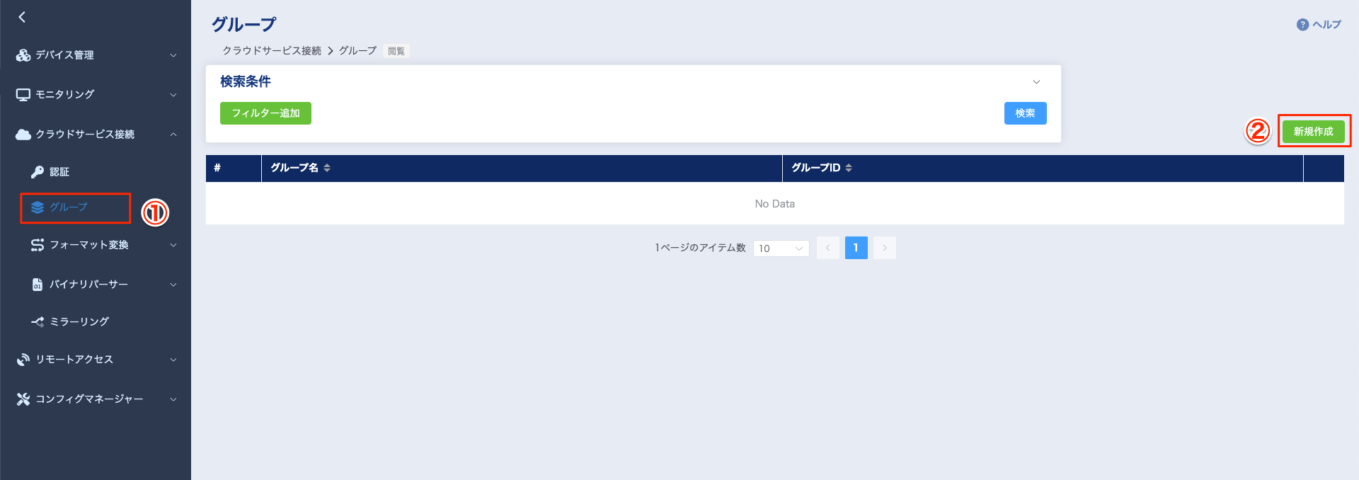 IoT Connect Gateway では、各種クラウドに「グループ」と言う単位で接続設定を行います。これにより、デバイスそれぞれに接続の設定を行う事なく、クラウドへの通信が可能になります。