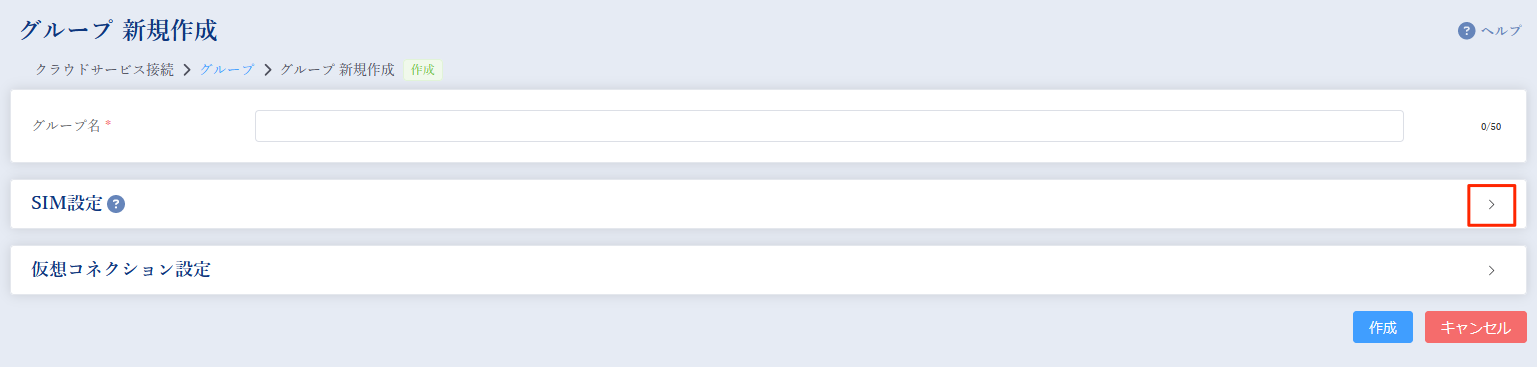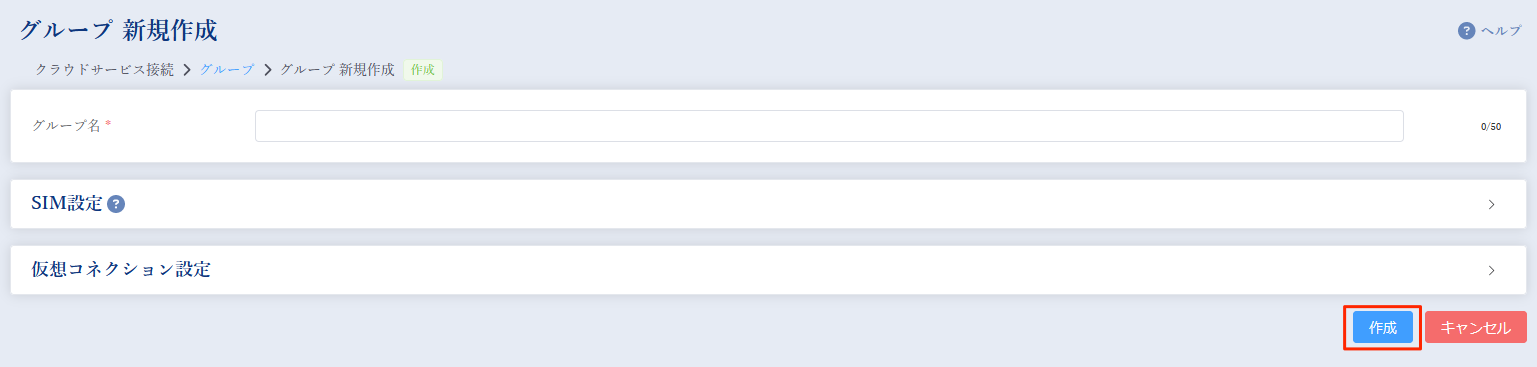 グループの作成のみを行う方法です。グループの作成のみ実施後にも、SIMまたは仮想コネクションの割当は別途可能です。詳細については、SIMの場合はこちらの「 「グループ」へのSIMの割当 」、仮想コネクションの場合はこちらの「 「グループ」への 仮想コネクション の割当 」を参照ください。
