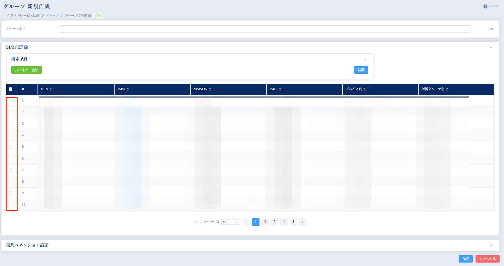 グループ作成と同時に仮想コネクションを割り当てる事も可能です。赤枠の「>」をクリックすると、登録済みの 仮想コネクション が一覧で表示されます。