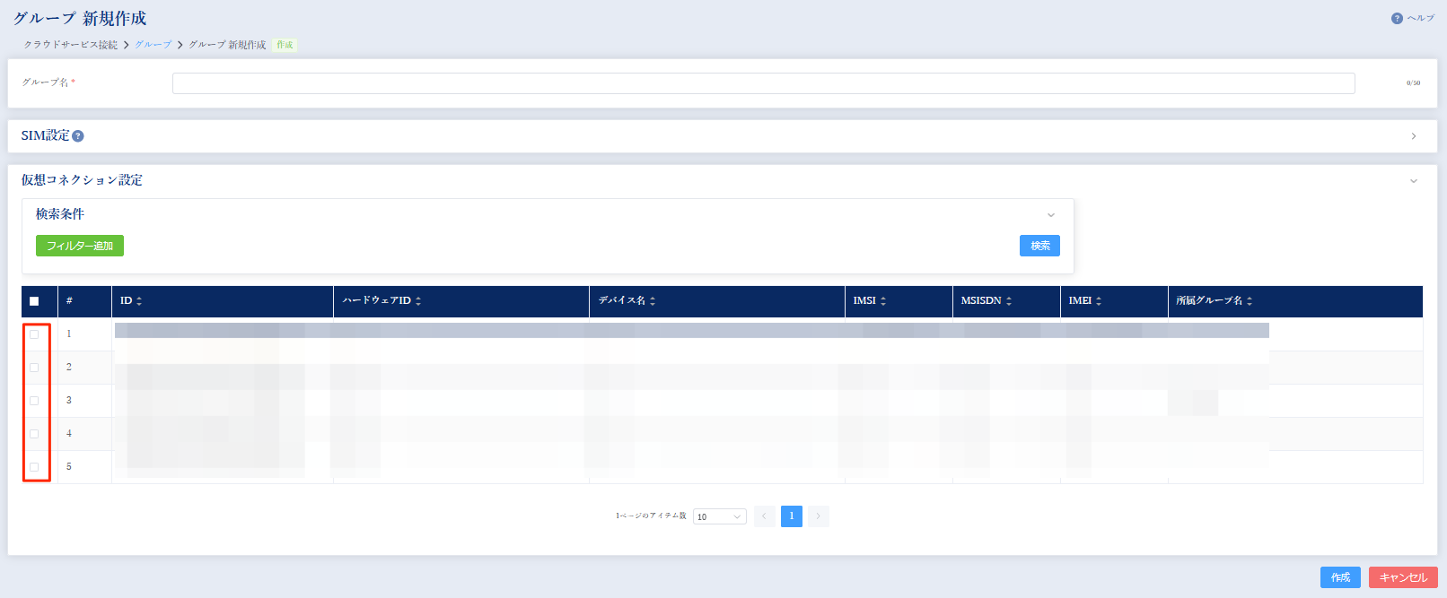 グループ作成と同時にSIMを割り当てる事も可能です。赤枠の「>」をクリックすると、SIMが一覧で表示されます。
