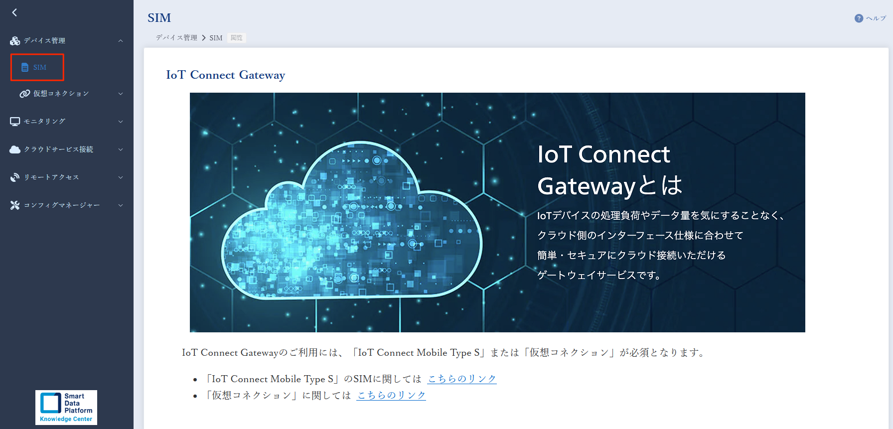 IoT Connect Gateway のコンソール画面が表示されますので、左側のメニューから、「デバイス管理」 > 「SIM」をクリックします。