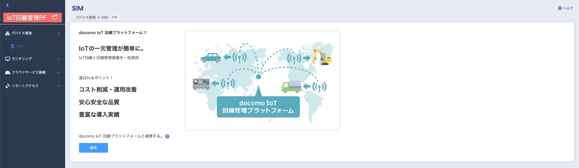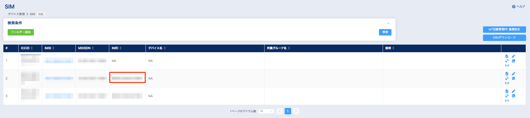 左側のメニューから、「デバイス管理」 > 「SIM」をクリックします。SIM連携がお済みの場合は、 docomo IoT回線管理プラットフォーム のSIMが以下のような一覧で表示されます。