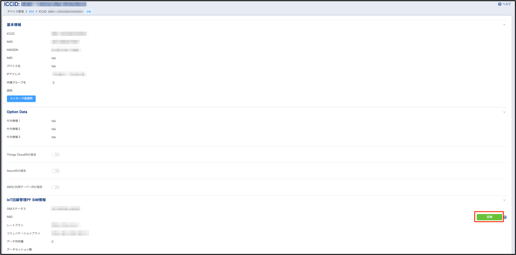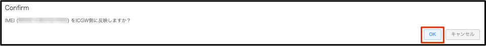 「IoT回線管理PF SIM情報」項目にある「反映」ボタンをクリック > 「OK」をクリックすると、対象SIMのIMEIを反映します。