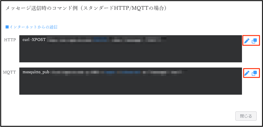 メッセージ送信時のコマンド例が表示されます。鉛筆アイコンをクリックすると、コマンドを編集出来ます。コピーアイコンをクリックすると、コマンド例をコピー出来ます。