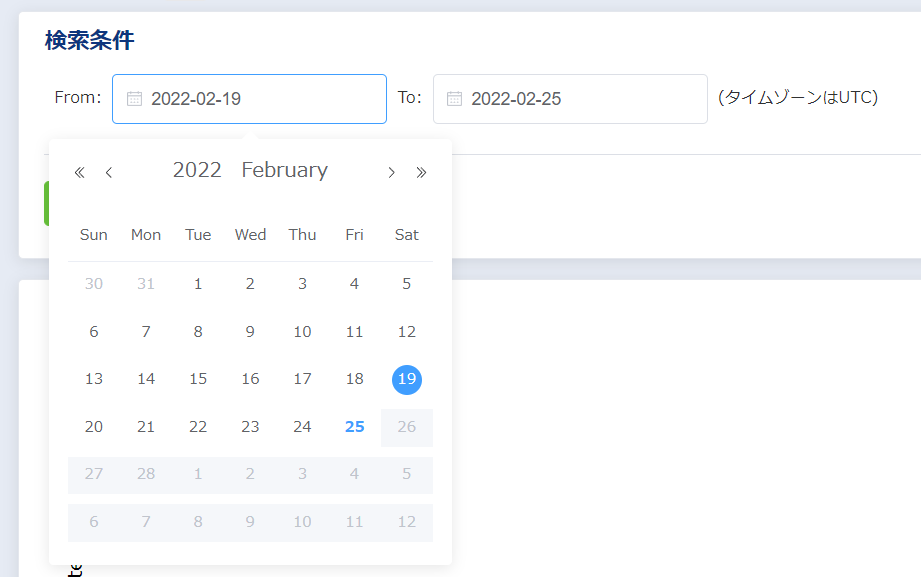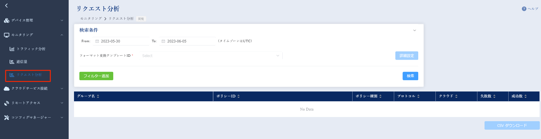 日付、 フォーマット変換 テンプレートID、フィルター条件を任意で指定し、「検索」ボタンを押すと、 フォーマット変換 のリクエストデータが表示されます。