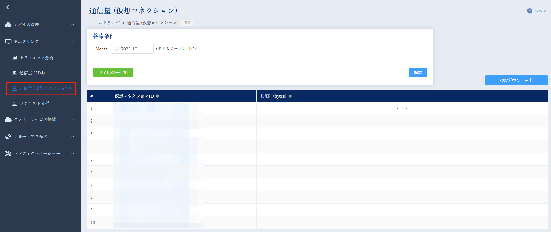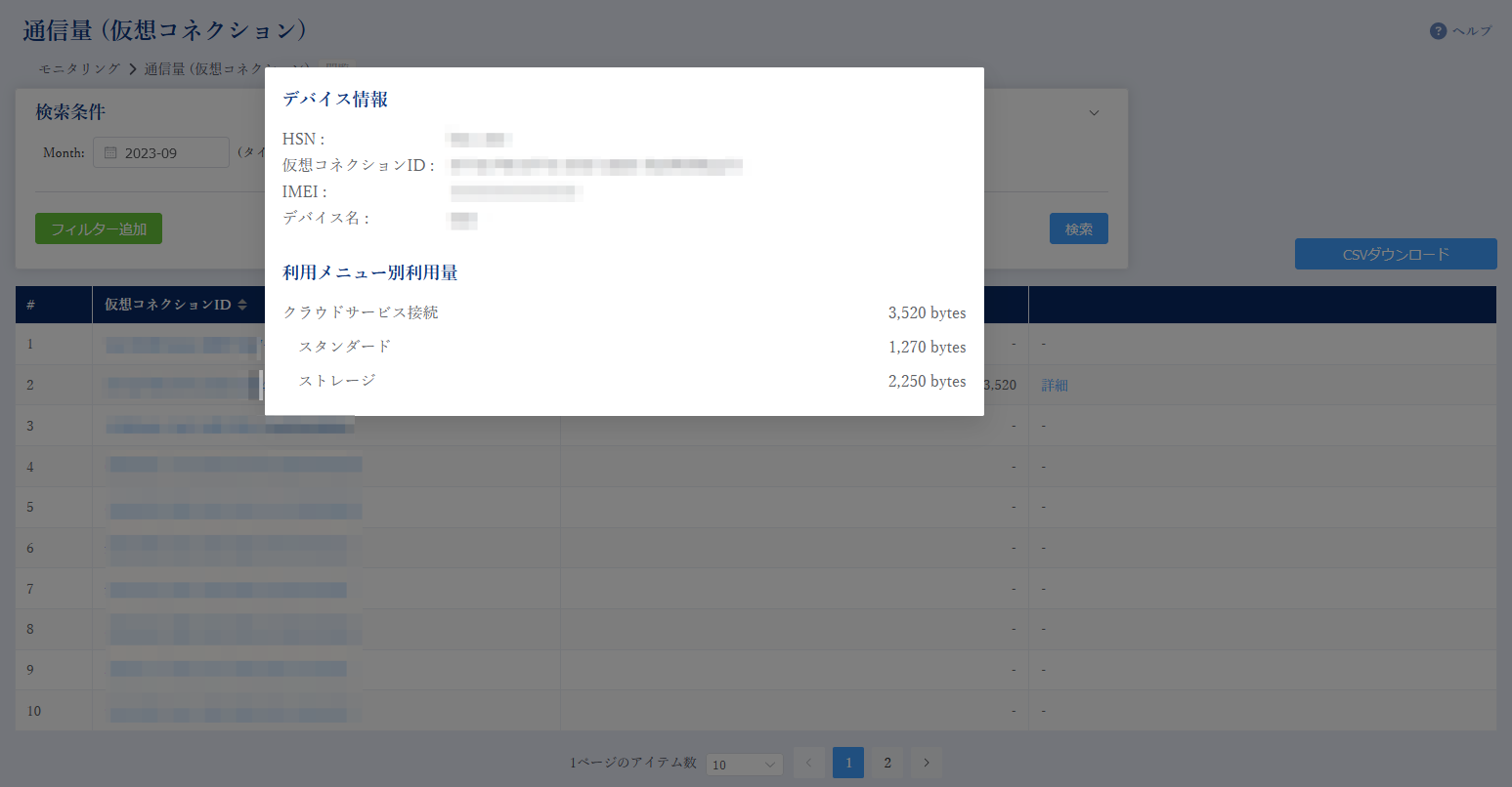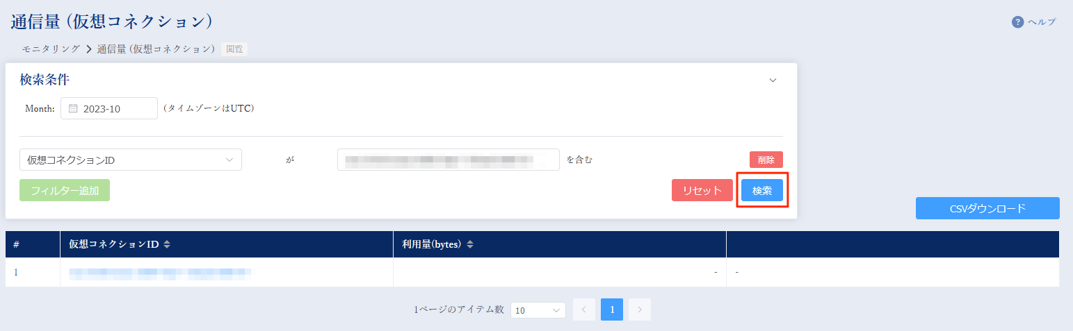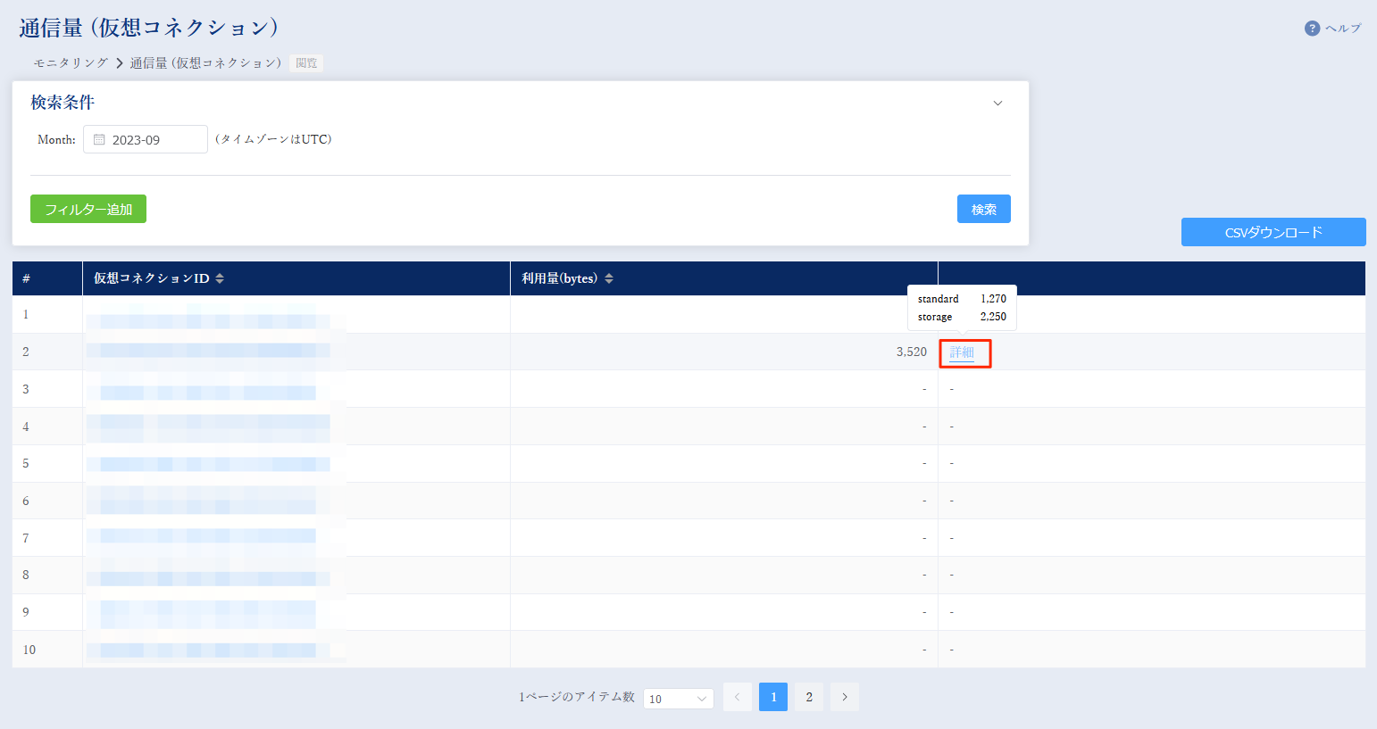 初期表示では、当月分の全仮想コネクション個別の利用量データを明細表示します。