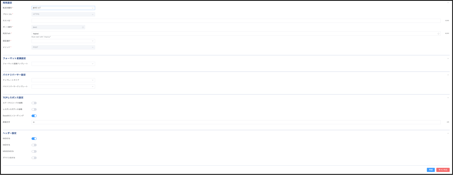 「AWS IoT」 側で受け取るパスを指定してください。AWSの場合は、必ず /topics/ で始まる必要があります(必須)