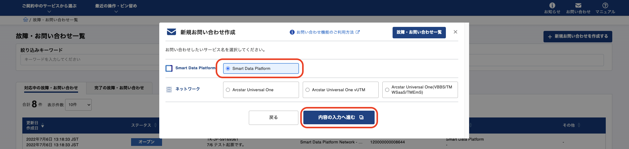 「Smart Data Platform」サービスを選択し、「内容の入力へ進む」をクリックします。