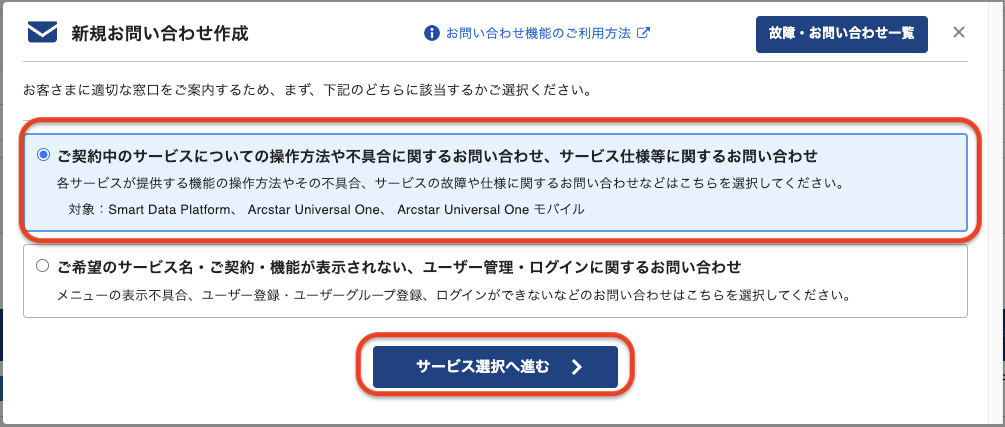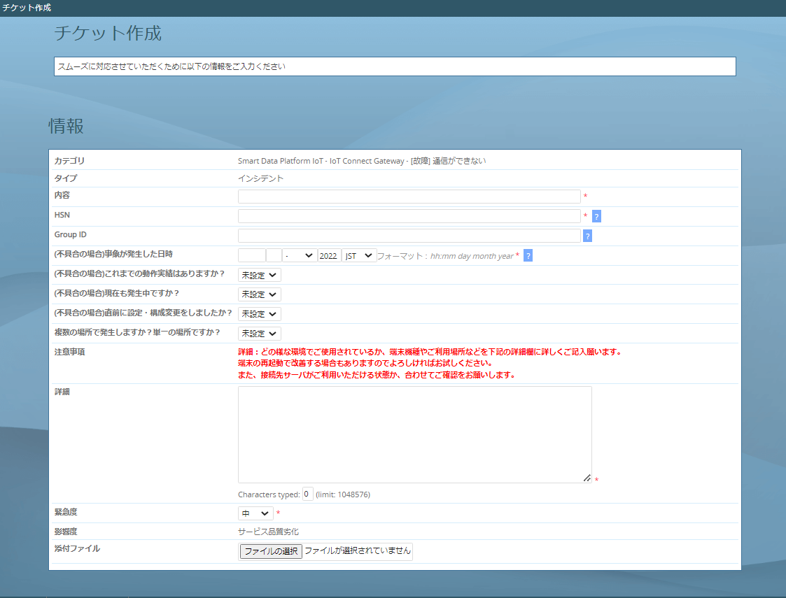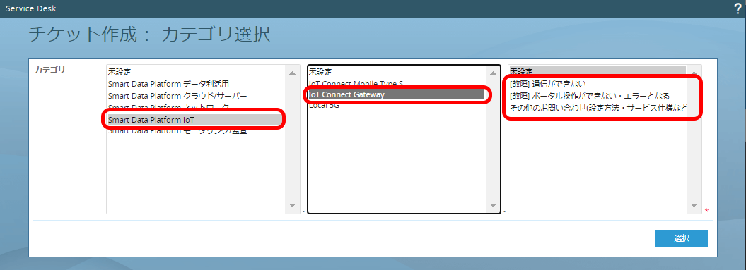 IoT Connect Gateway に関するチケットを起票する場合、「Smart Data Platform IoT」、「IoT Connect Gateway」を選択し、お問い合わせ内容にあったチケット種別を選択してください 。