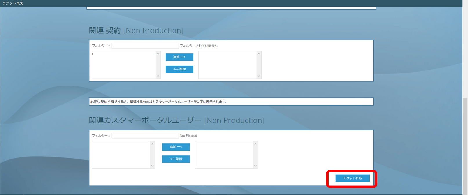 必要事項を入力後、関連する契約番号およびユーザーを追加し、「チケット作成」をクリックします。 契約番号およびユーザーは、左側で選択し、中央の「追加」をクリックすることで追加出来ます。