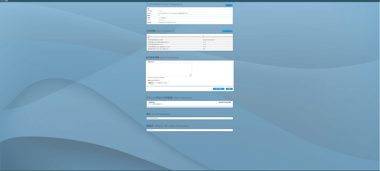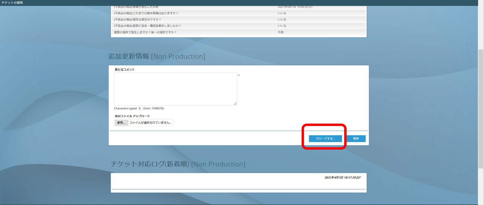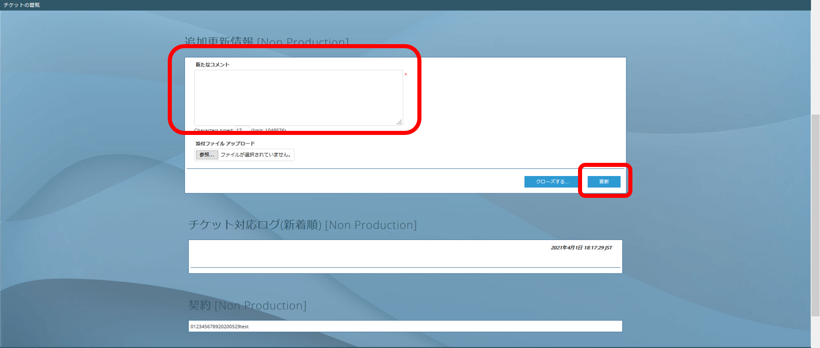 追加更新情報に返信内容を入力し、「更新」をクリックします。スクリーンショットやログファイルなどのファイルがある場合、チケットに添付することが可能です。