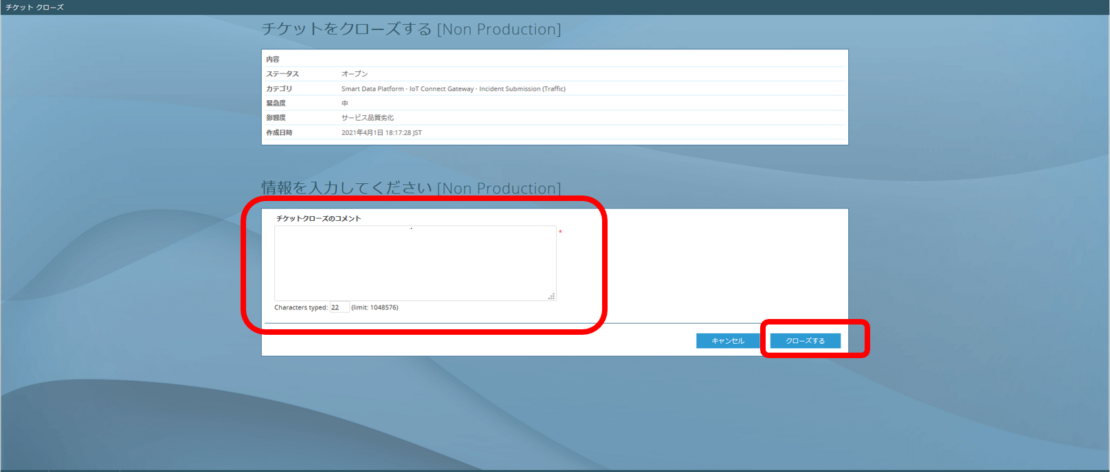 チケット詳細の追加更新情報の「クローズする」をクリックし、チケットクローズのコメント(入力必須)にコメントを入力して「クローズする」をクリックしてください。