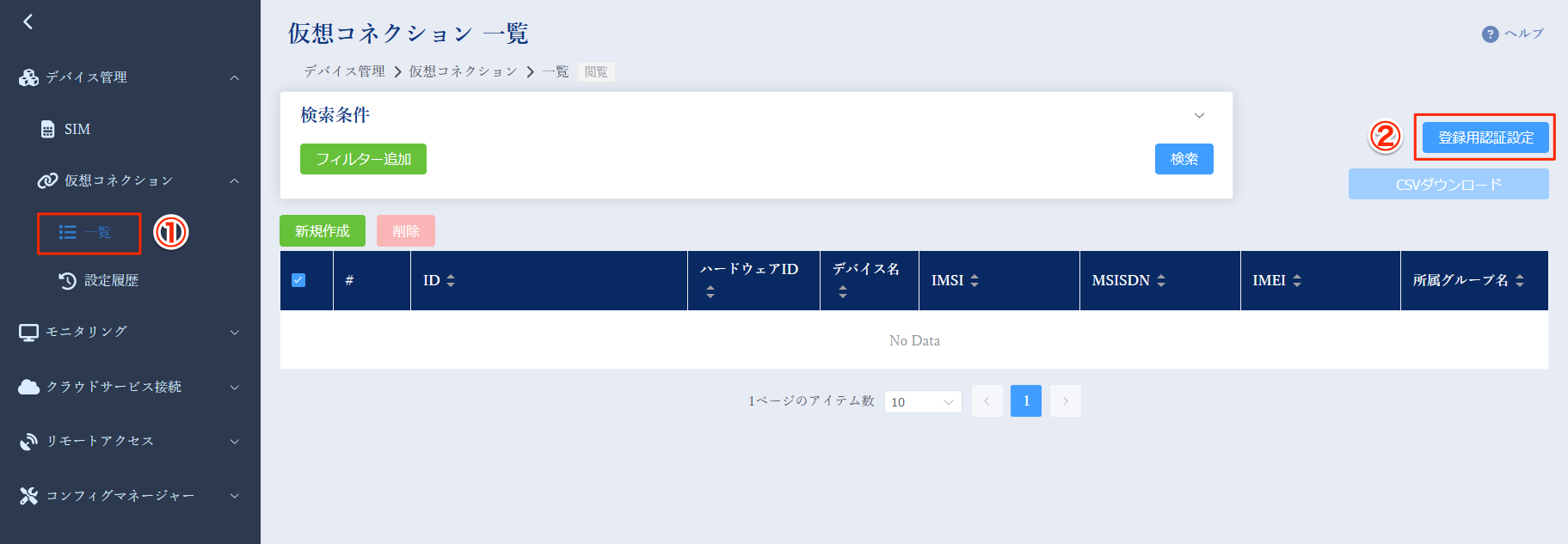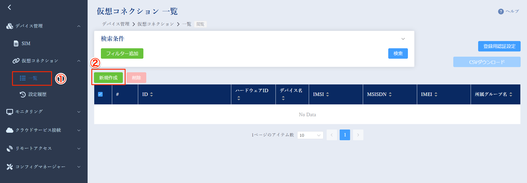 左側のメニューから、「 仮想コネクション 」 > 「一覧」をクリックします。