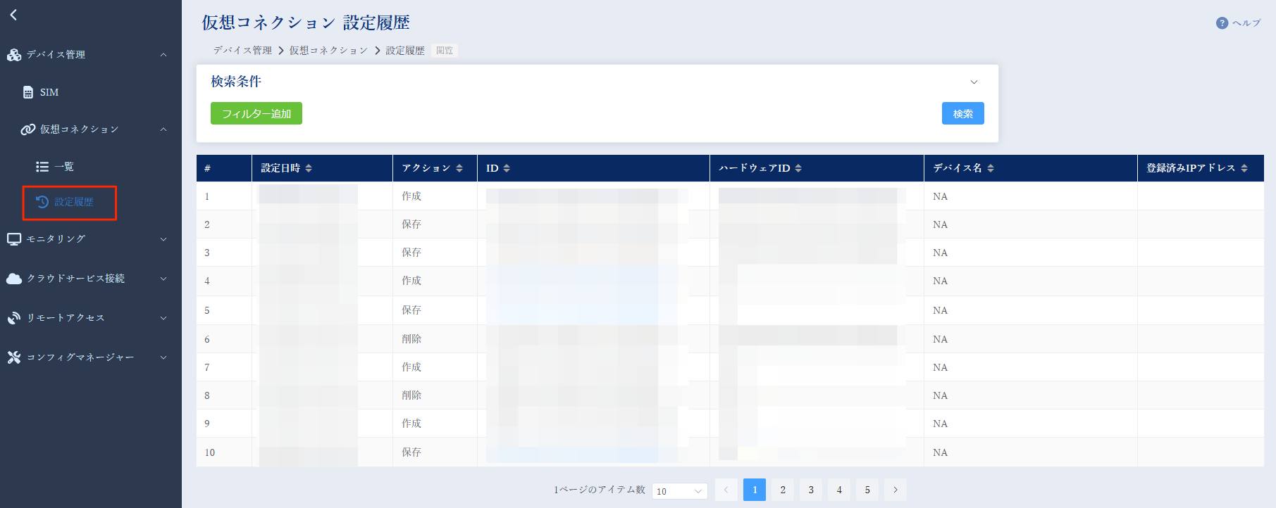 フィルター条件を任意で指定し、「検索」ボタンを押すと、 仮想コネクション の設定履歴が表示されます。